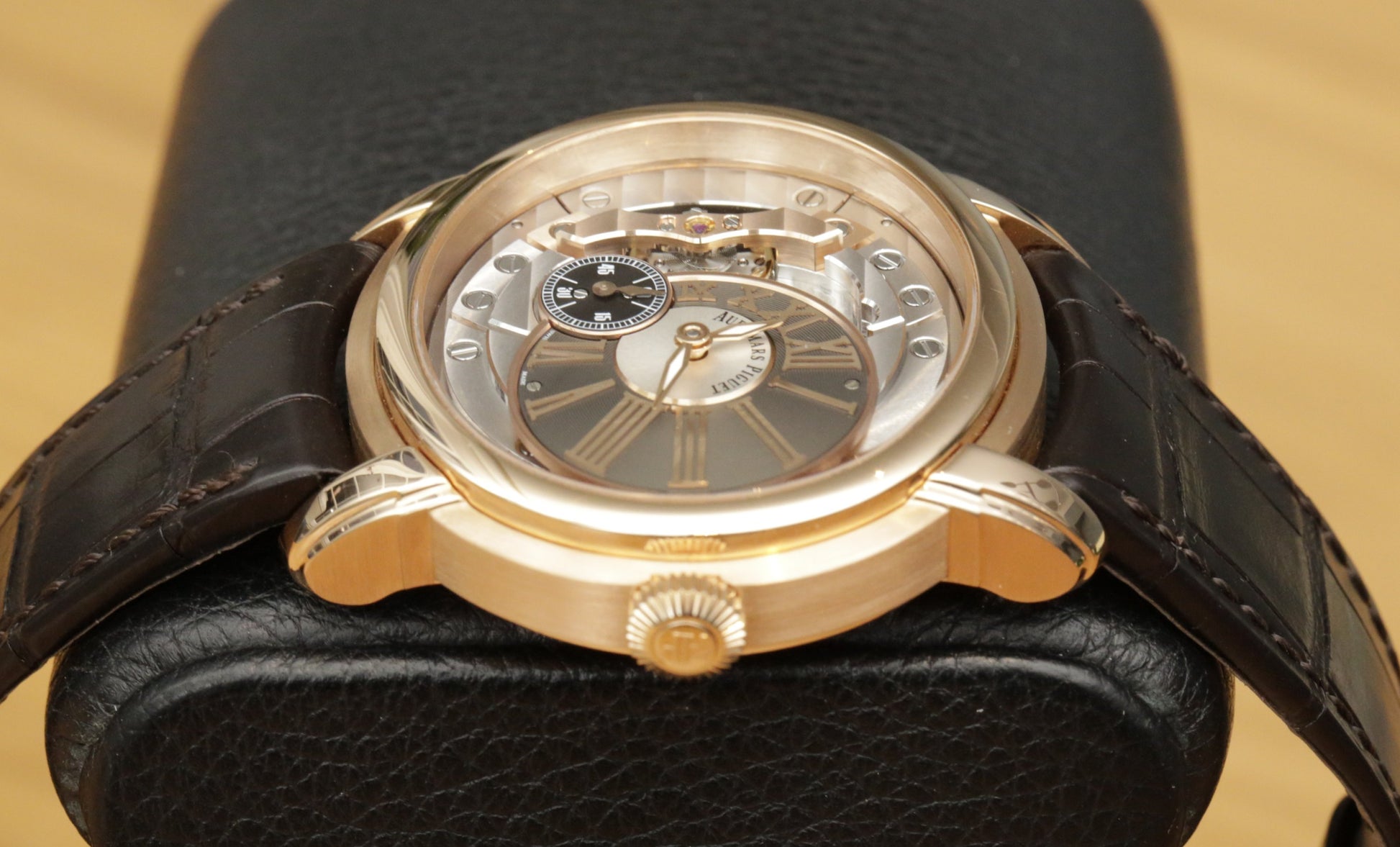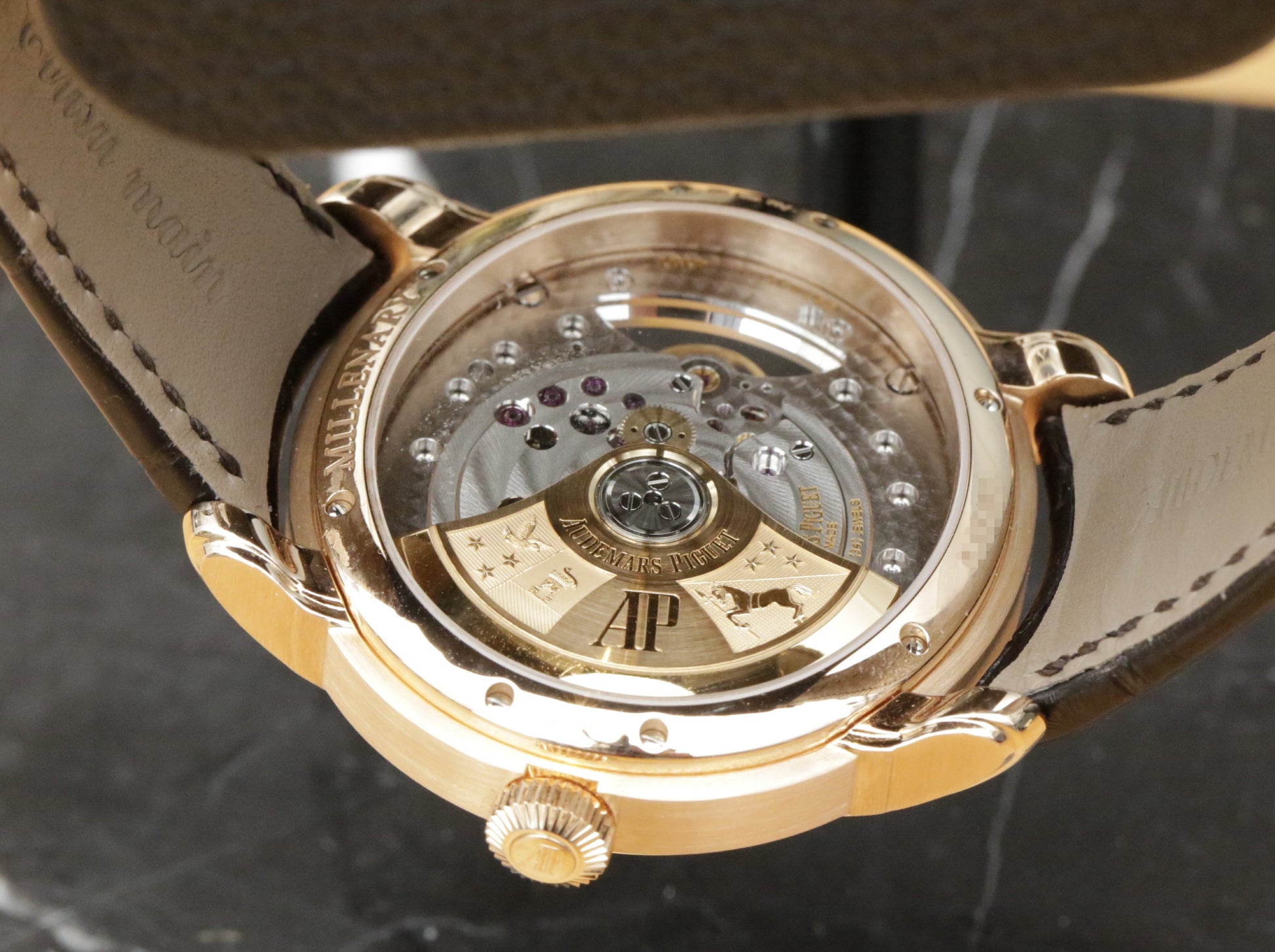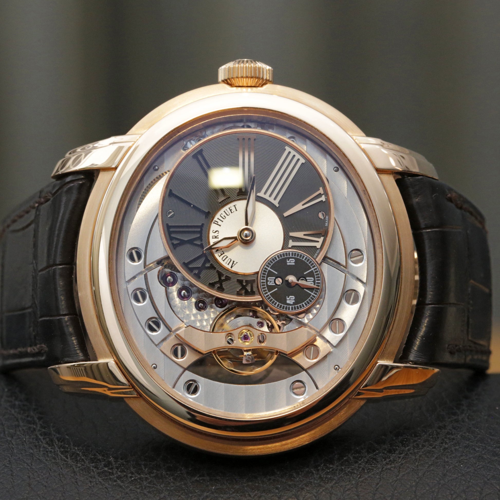 Full set 15350OR.OO.D093CR.01 Millenary 4101, serviced by AP in Le Brassus with a service card dated April 2025. 18 ct rose gold elliptical case 47 mm x 43 mm, 13 mm thick, sapphire front and back, 2 bar water resistance. Off centred dial with Roman numerals and small seconds, anthracite and silver tones, brown alligator strap with rose gold deployant.