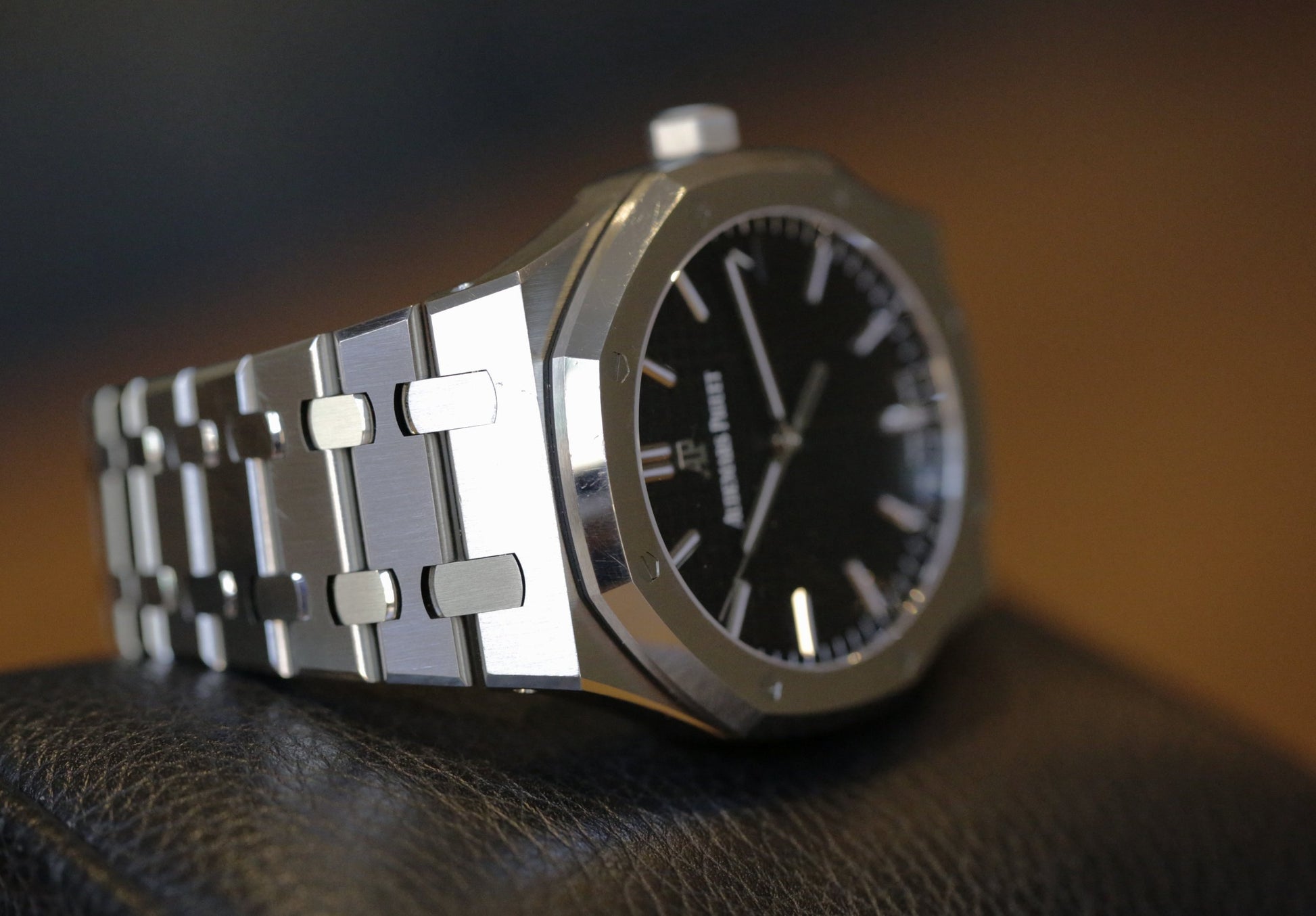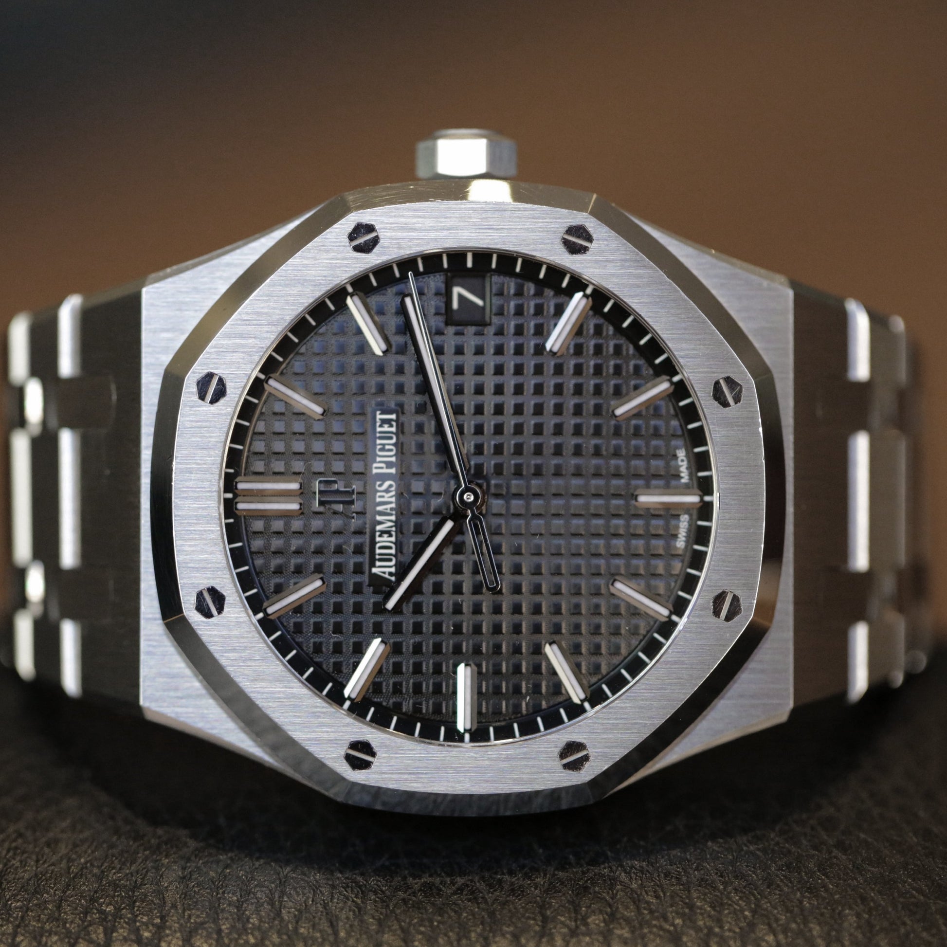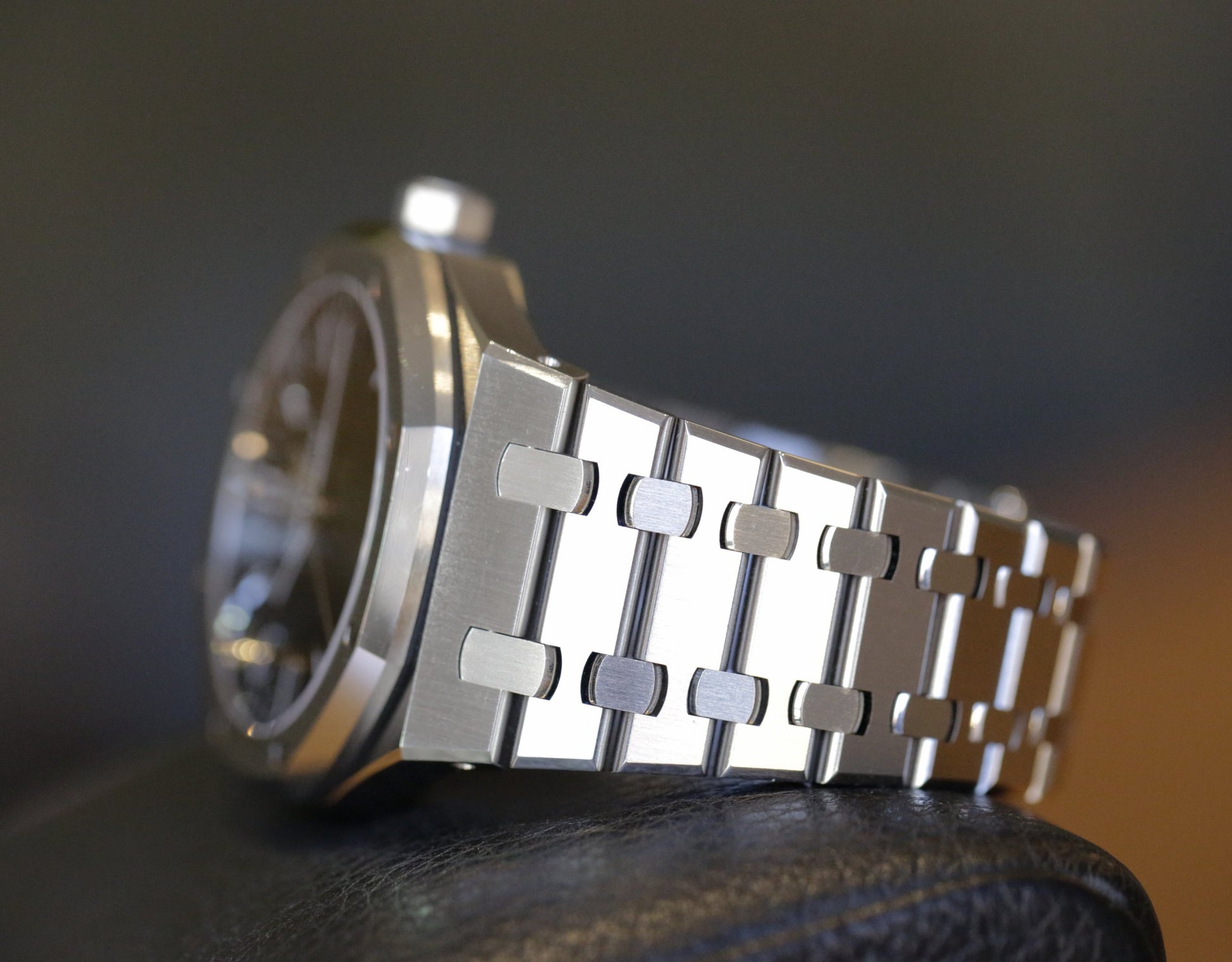Royal Oak collectors will appreciate the subtle updates Audemars Piguet brought to the reference 15500ST. This 41 mm steel icon has a cleaner dial layout than its predecessors, note the absence of “Automatic” on the dial and a date window now positioned further out, giving better balance to the black Grande Tapisserie dial. Our example went back to Le Brassus for a full AP service in December 2023, meaning it’s running perfectly and its original sharp lines are well intact. The watch is under AP factory warranty till April 2026. All the trademark brushed surfaces and polished bevels of the case and bracelet still meet at crisp edges, preserving the Royal Oak’s signature mix of finishes.