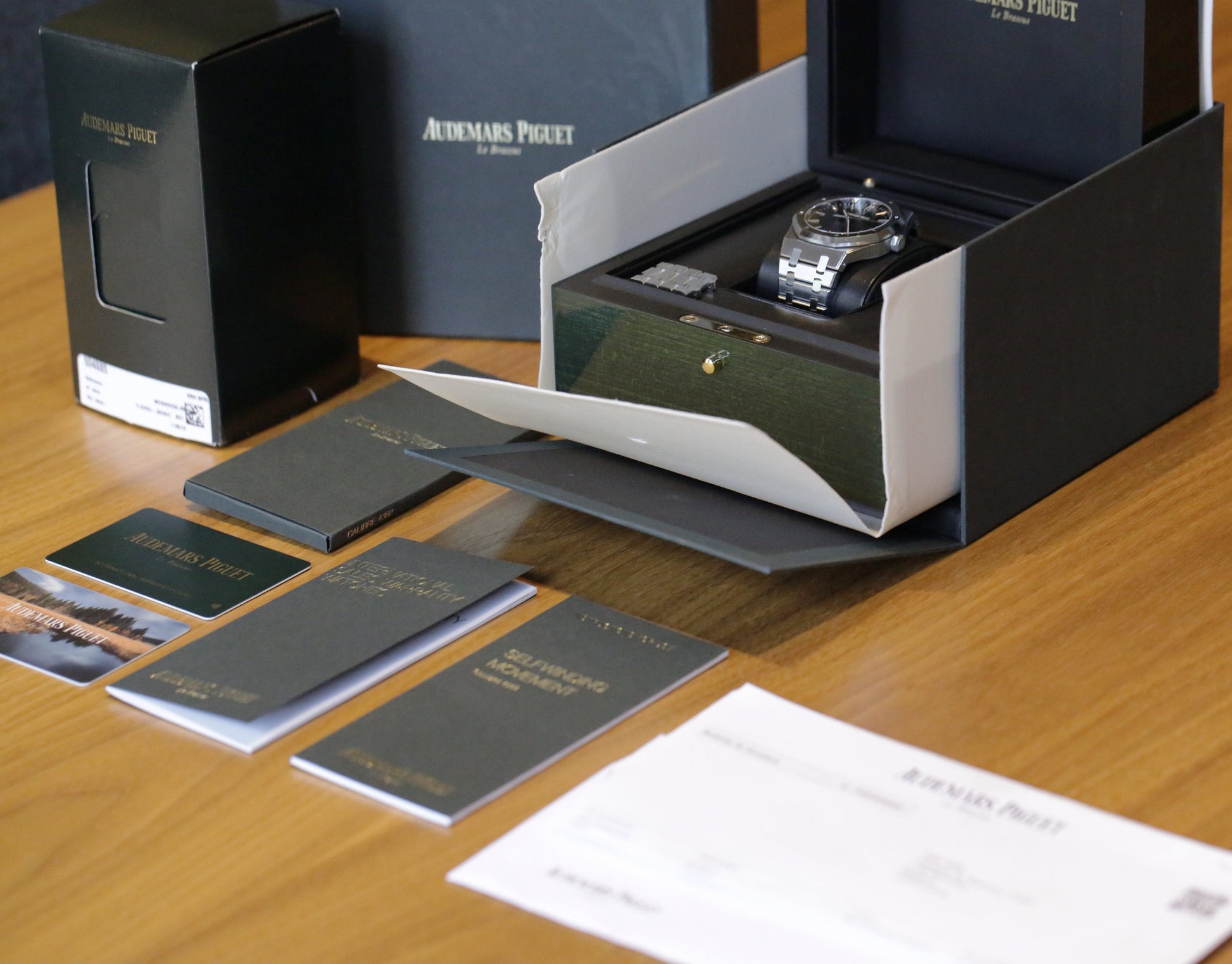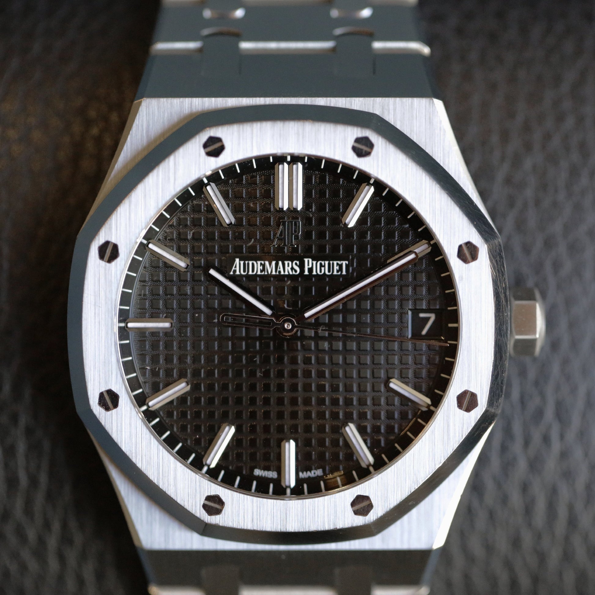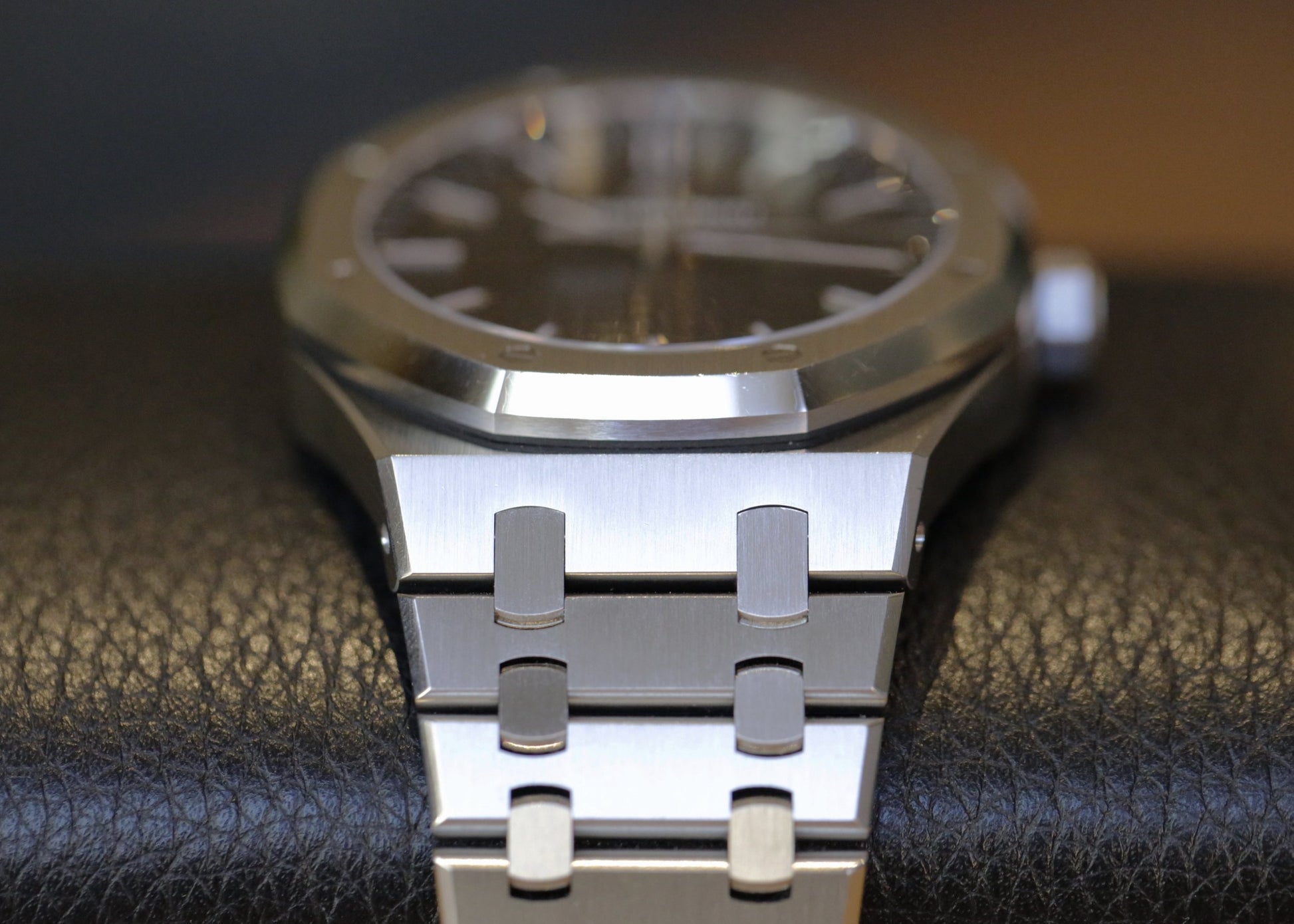Royal Oak collectors will appreciate the subtle updates Audemars Piguet brought to the reference 15500ST. This 41 mm steel icon has a cleaner dial layout than its predecessors, note the absence of “Automatic” on the dial and a date window now positioned further out, giving better balance to the black Grande Tapisserie dial. Our example went back to Le Brassus for a full AP service in December 2023, meaning it’s running perfectly and its original sharp lines are well intact. The watch is under AP factory warranty till April 2026. All the trademark brushed surfaces and polished bevels of the case and bracelet still meet at crisp edges, preserving the Royal Oak’s signature mix of finishes.