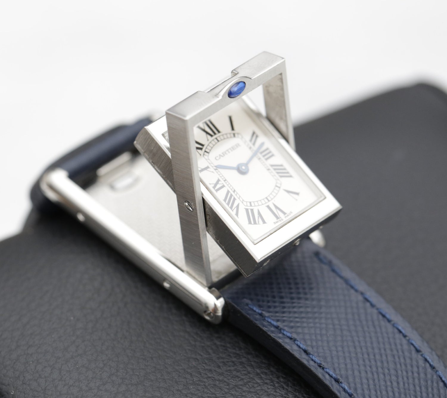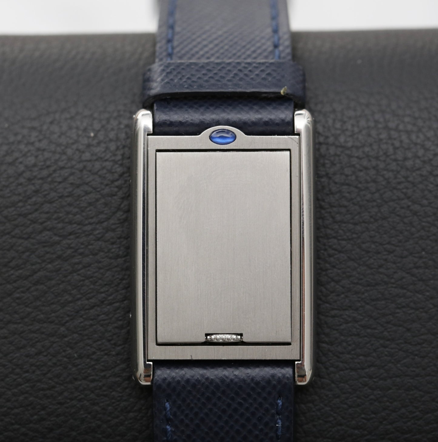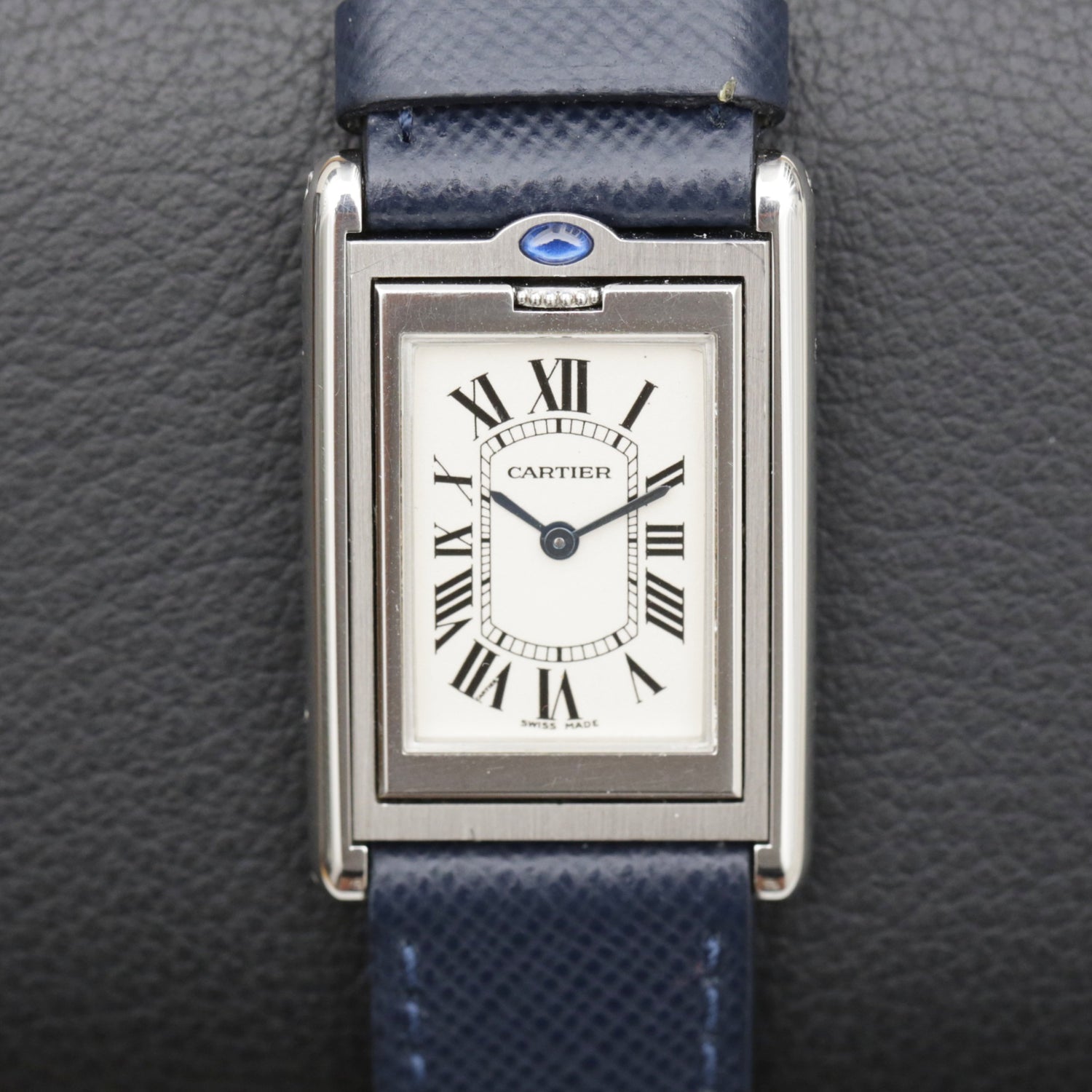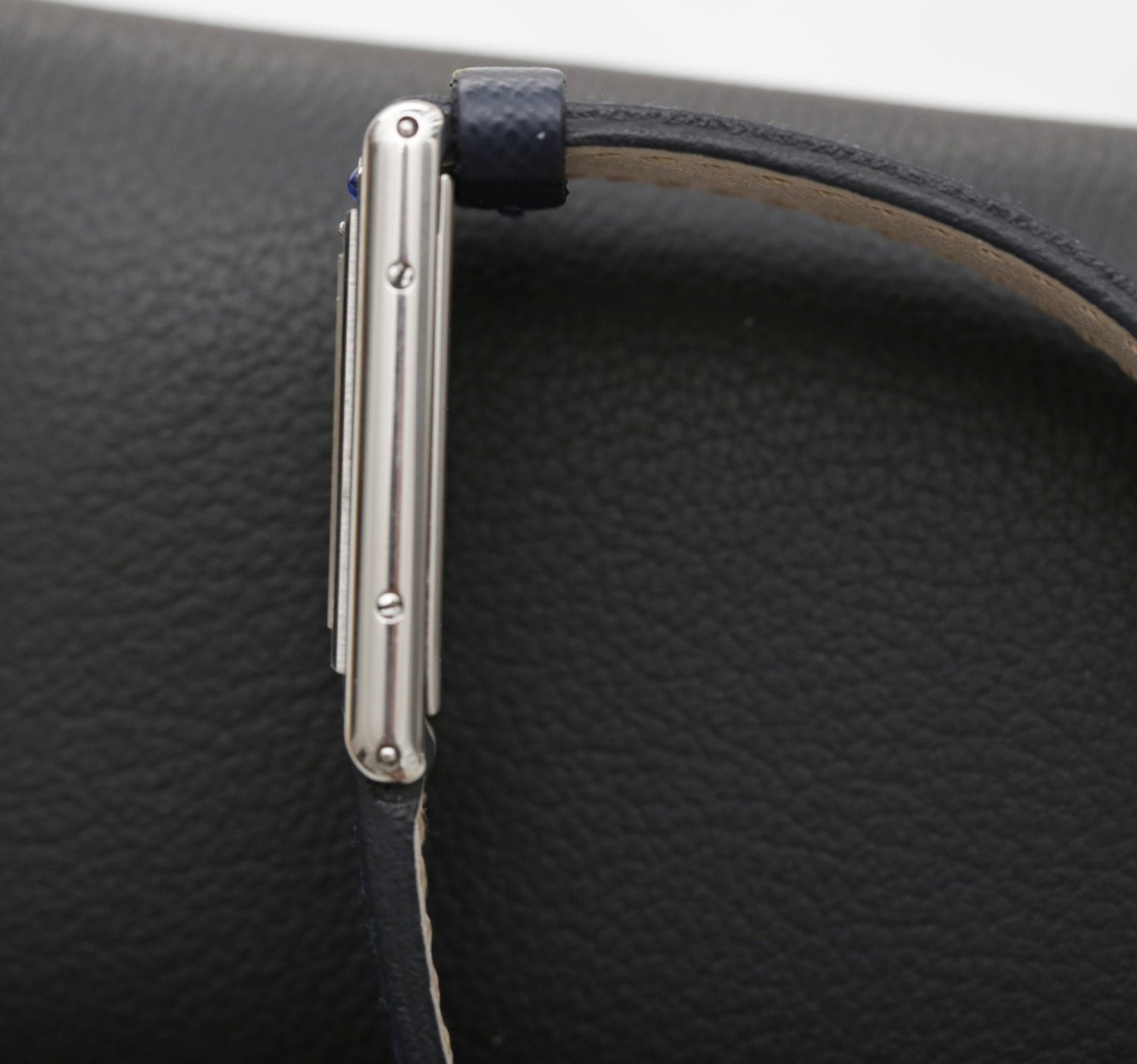The Cartier Tank has a rich heritage dating back to the first quarter of the 20th century. The Tank Basculante was presented by Cartier in 1933. This piece dates to the early 2000s and features a quartz movement in the steel case that measures 35x22 mm. The white dial has black Roman numerals and the ‘secret’ Cartier signature in the VII numeral. The blue cabochon at 12 o’clock is used to reverse the inner case of the watch through a 360 degree rotation. The watch can also double as a table clock.