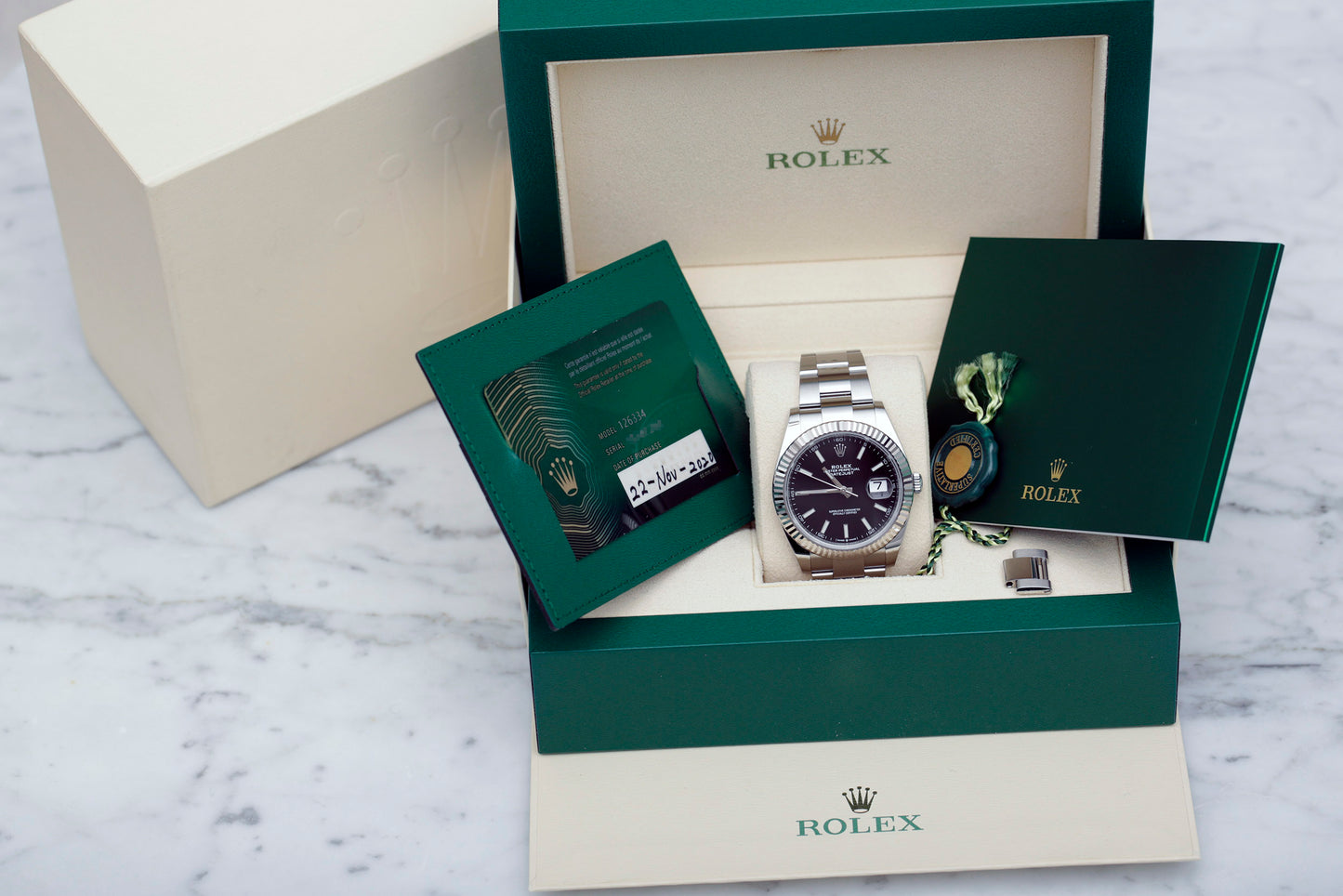 Roled Datejust 41 with a black dial, fluted white gold bezel and the Oyster bracelet. The card is dated 22 November 2020.