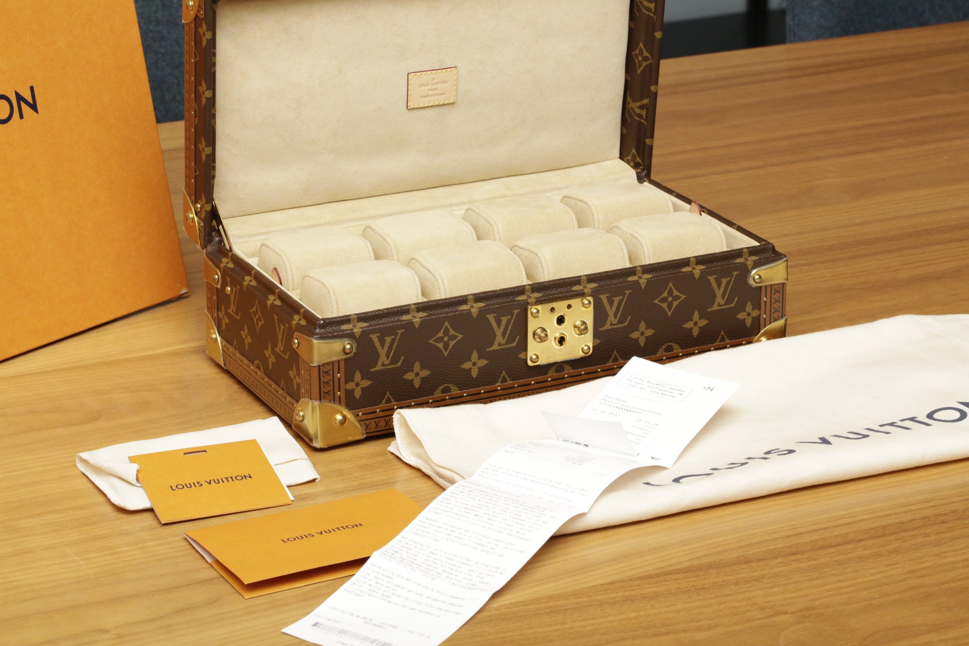 Louis Vuitton Coffret 8 Montres watch case, reference M47641, in Monogram canvas. Like new condition with the protective plastic still intact on the metal hardware. Elegant and practical storage for up to 8 watches, ideal for travel or home use. Includes the original Louis Vuitton boutique invoice from Stockholm.