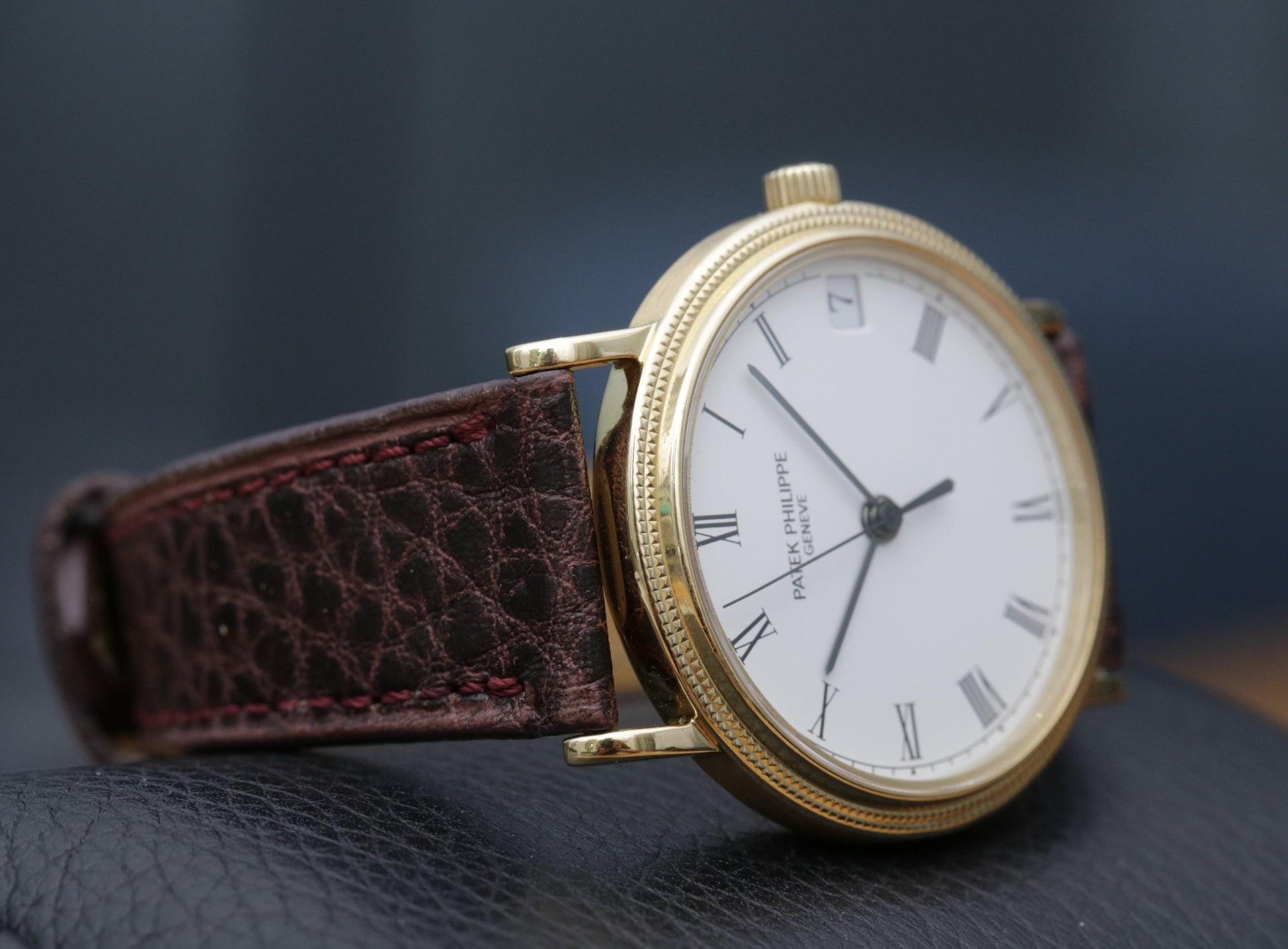 The Calatrava ref. 3802/200J strikes a rare balance between refinement and nuance. At 33 mm, its yellow‑gold case with Clous de Paris bezel interacts with light in a restrained yet deliberate way, no flash, just focused craftsmanship. The crisp white dial is punctuated by Roman numerals that harmonise with the slender date window, creating a quiet symmetry that rewards a practiced eye .