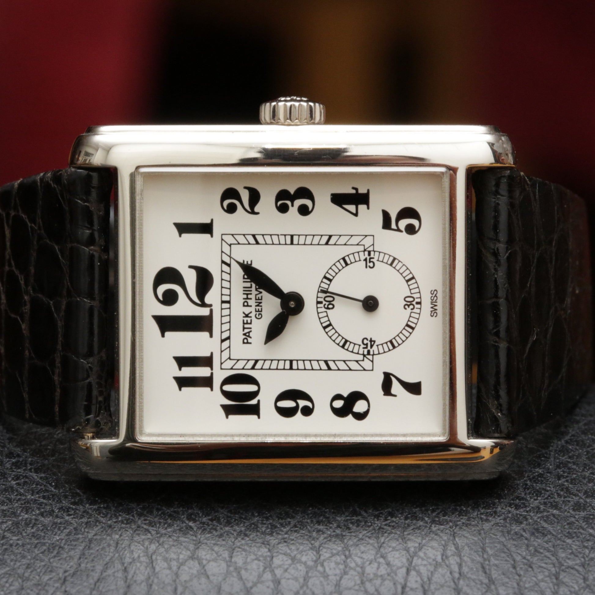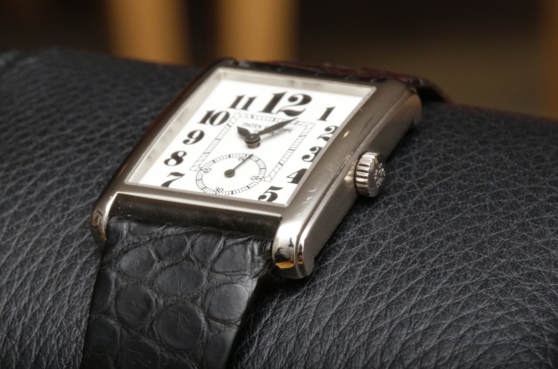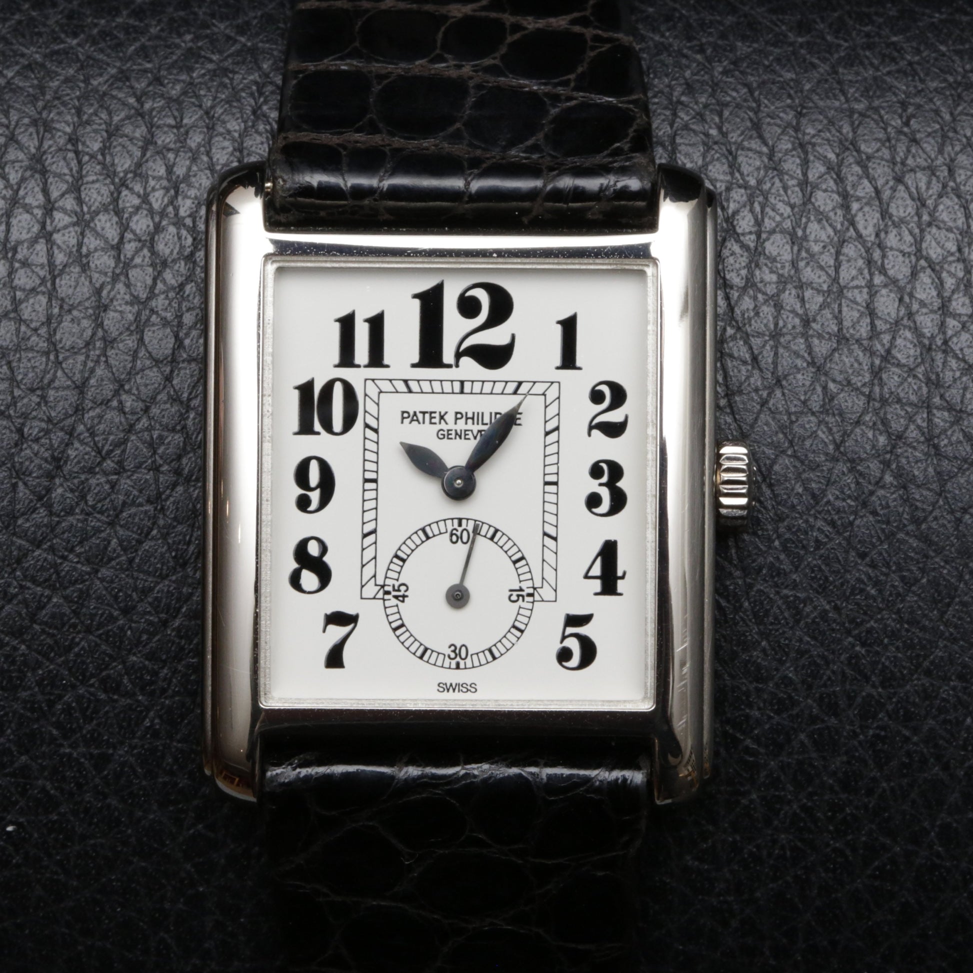 Gondolo ref. 5014G pairs a white dial with lacquered black art deco style arabic numerals, a striking twist on Patek’s rectangular dress line. 18k white gold case with stepped flanks, measuring 28 x 35 mm, and a small seconds at 6 for balance. Born from the 1990s Gondolo revival, it nods to the Chronometro Gondolo legacy in Brazil. This dial variant is seen far less often.