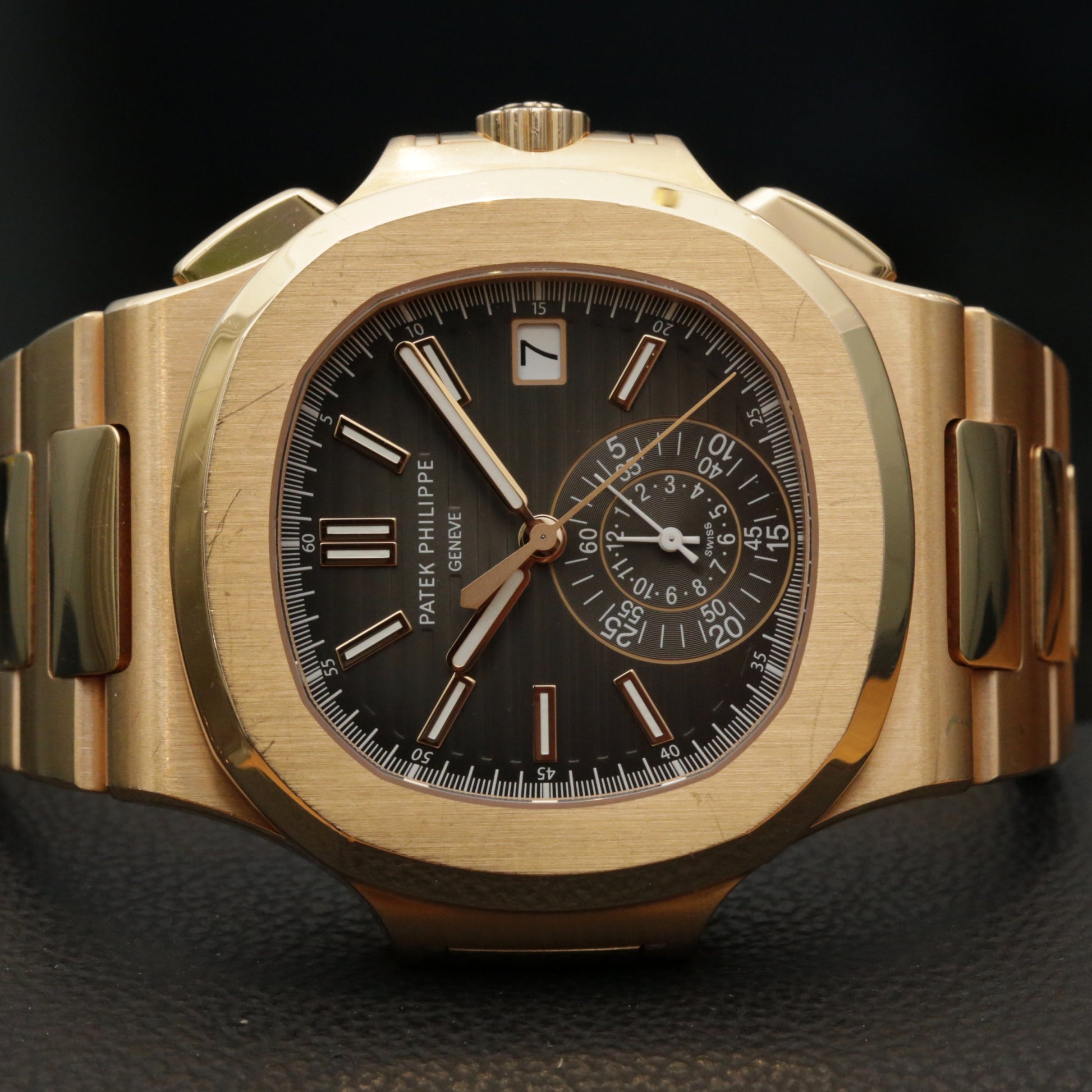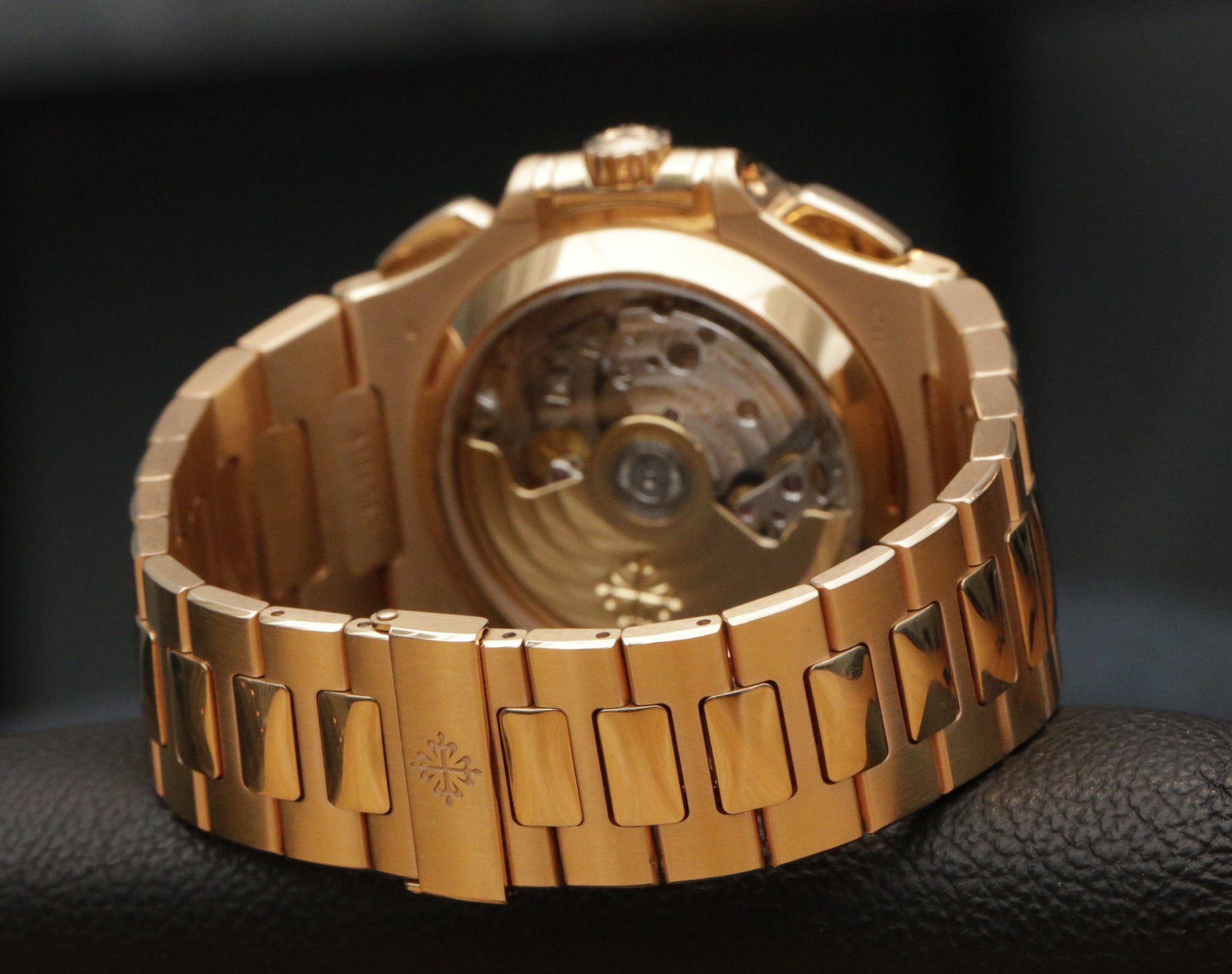 A 2017 5980R hits the sweet spot for collectors who want the Nautilus chronograph in full rose gold, on bracelet, with the classic brown to charcoal fume gradient and embossed horizontal dial. The 6 o clock mono counter keeps the layout clean, while the integrated pushers and screw down crown stay true to the case lines. Size wise it wears compact for precious metal at 40.5 mm and about 12.2 mm thick, with that sharp mix of satin brushing and polished bevels that makes the Nautilus.