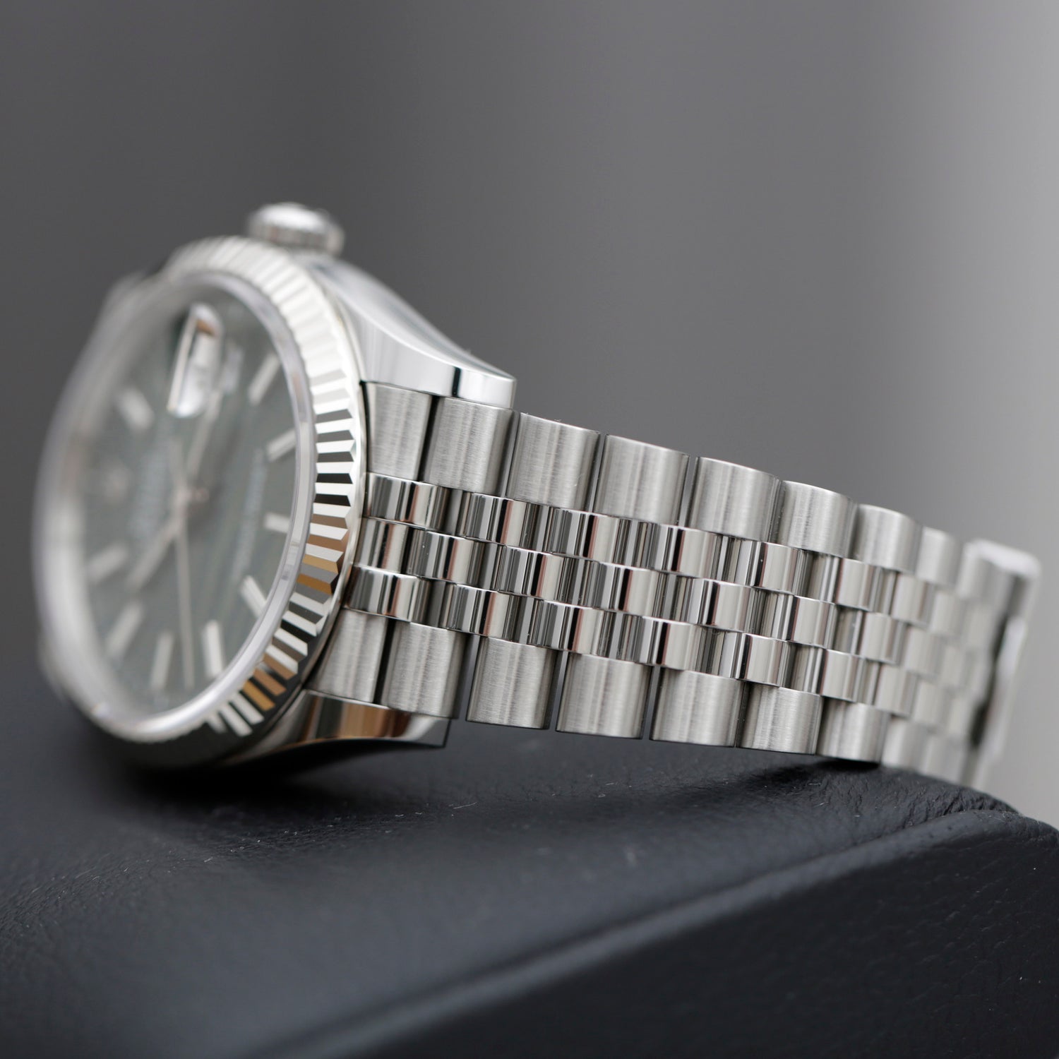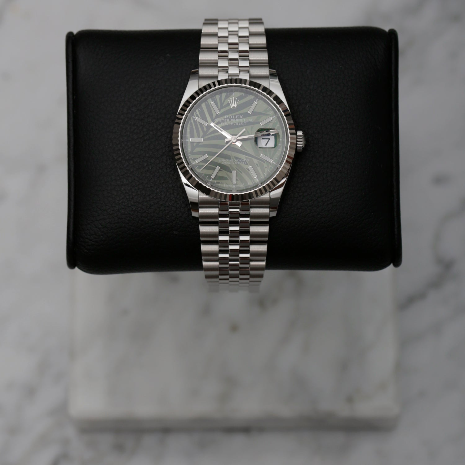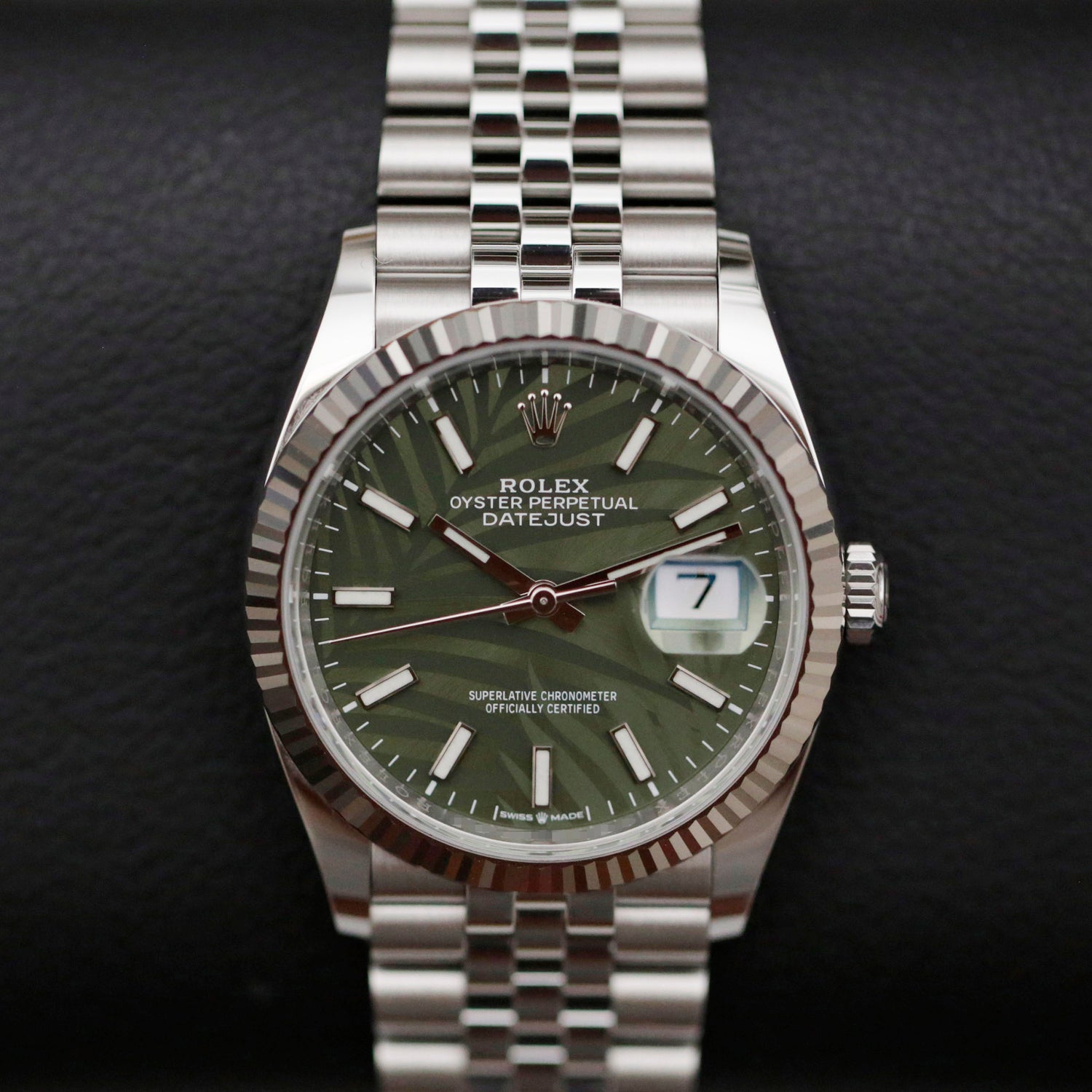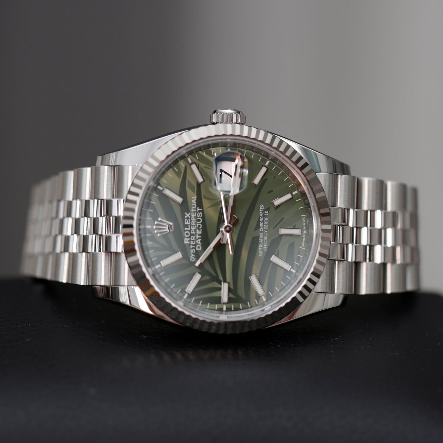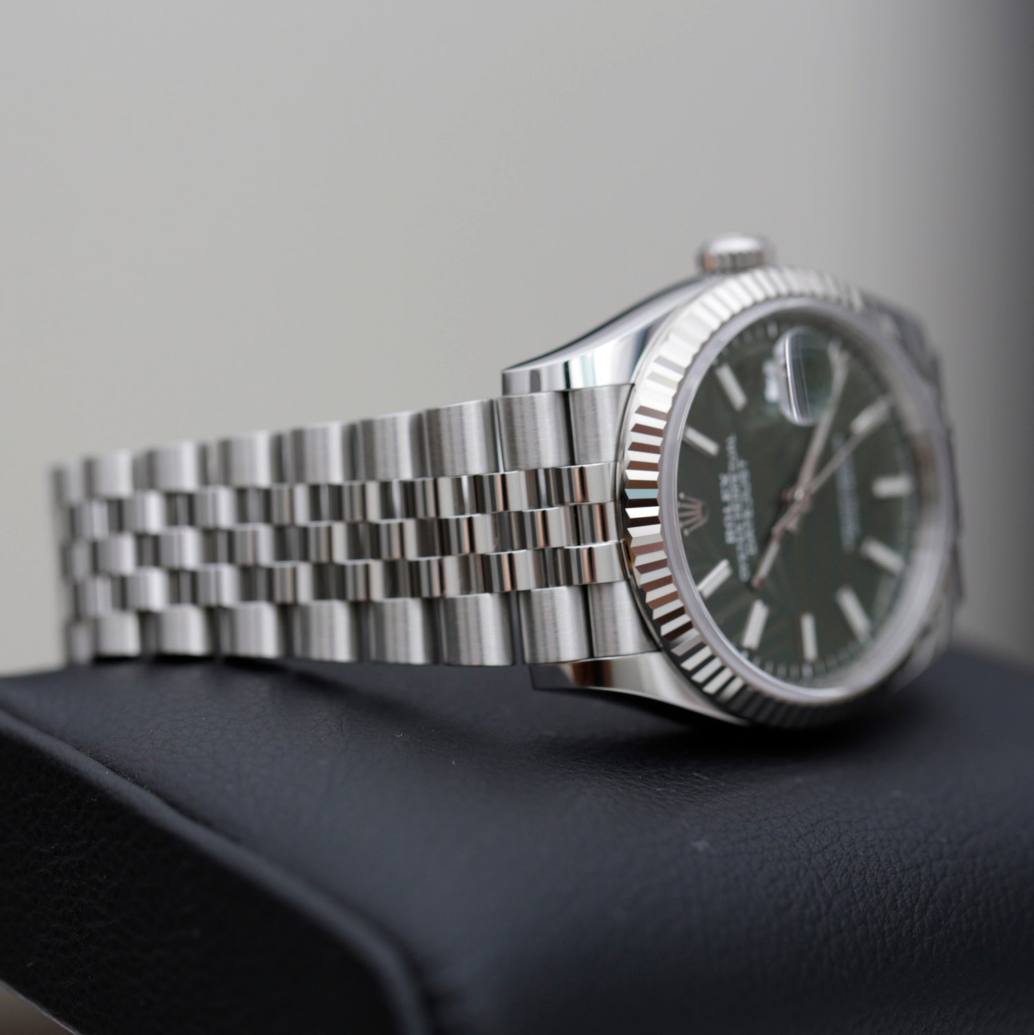 Rolex Datejust 36 with the green palm dial, in the most attractive specification with the white gold fluted bezel and jubilee bracelet. The watch is dated 25th November 2021 and is used but in absolute top condition.