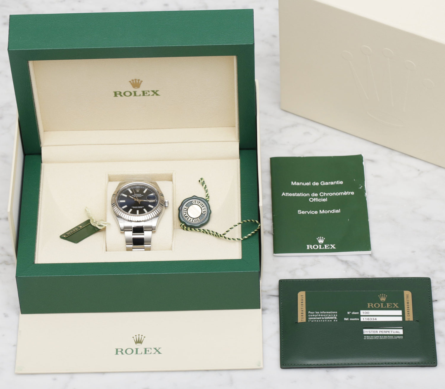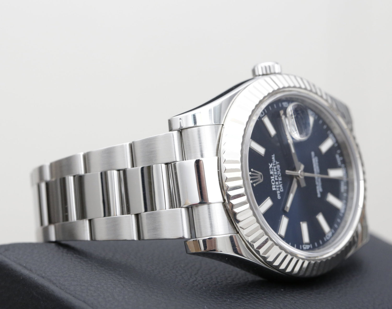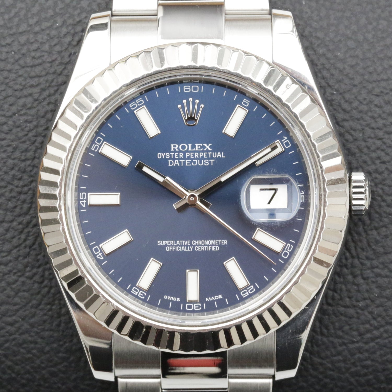 The Rolex 116334 with a blue dial with stick hour markers, and a self-winding Rolex caliber 3135 movement with a power reserve of up to 48 hours. The stainless steel Oyster bracelet complements the blue dial, making it a versatile watch for any occasion.
