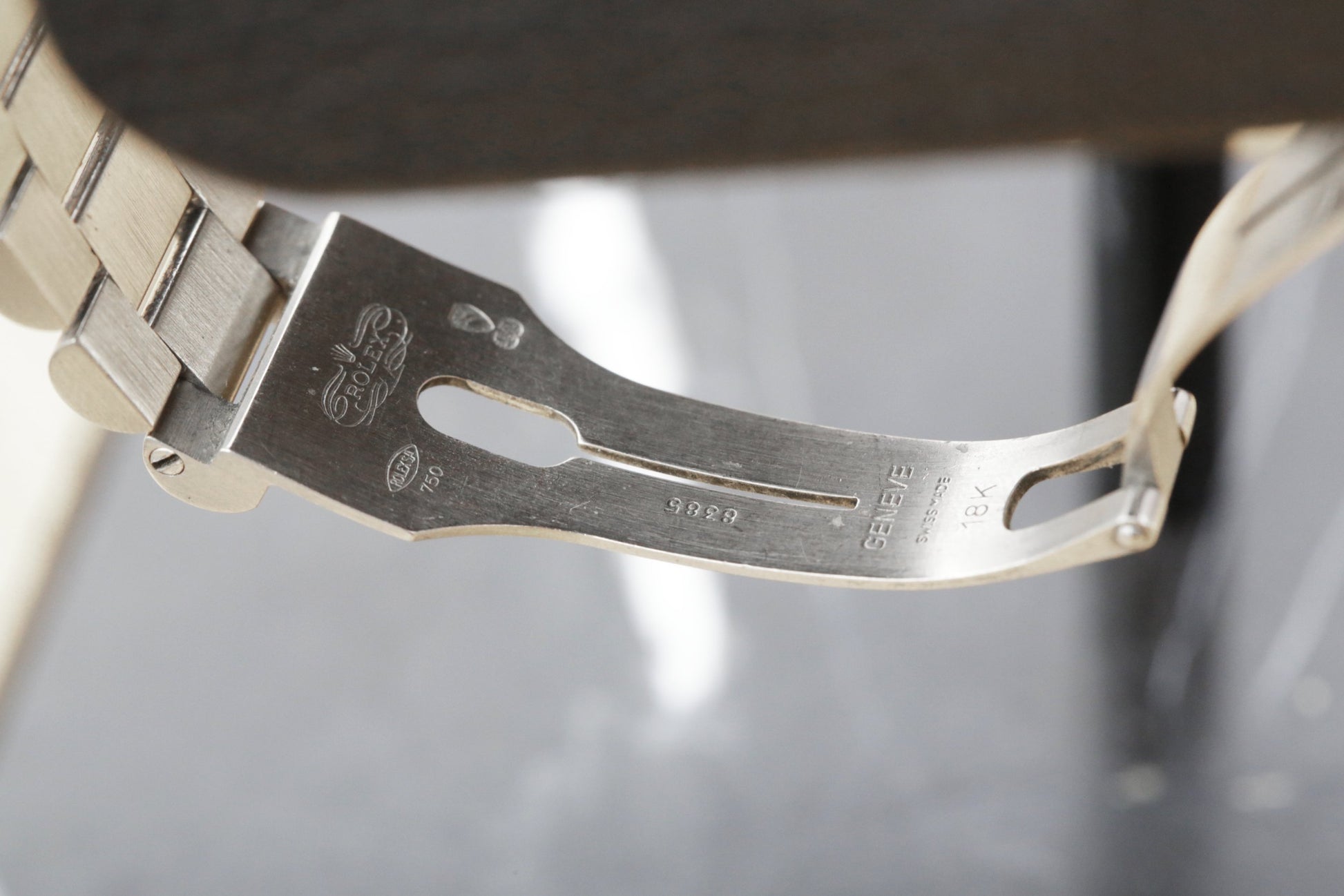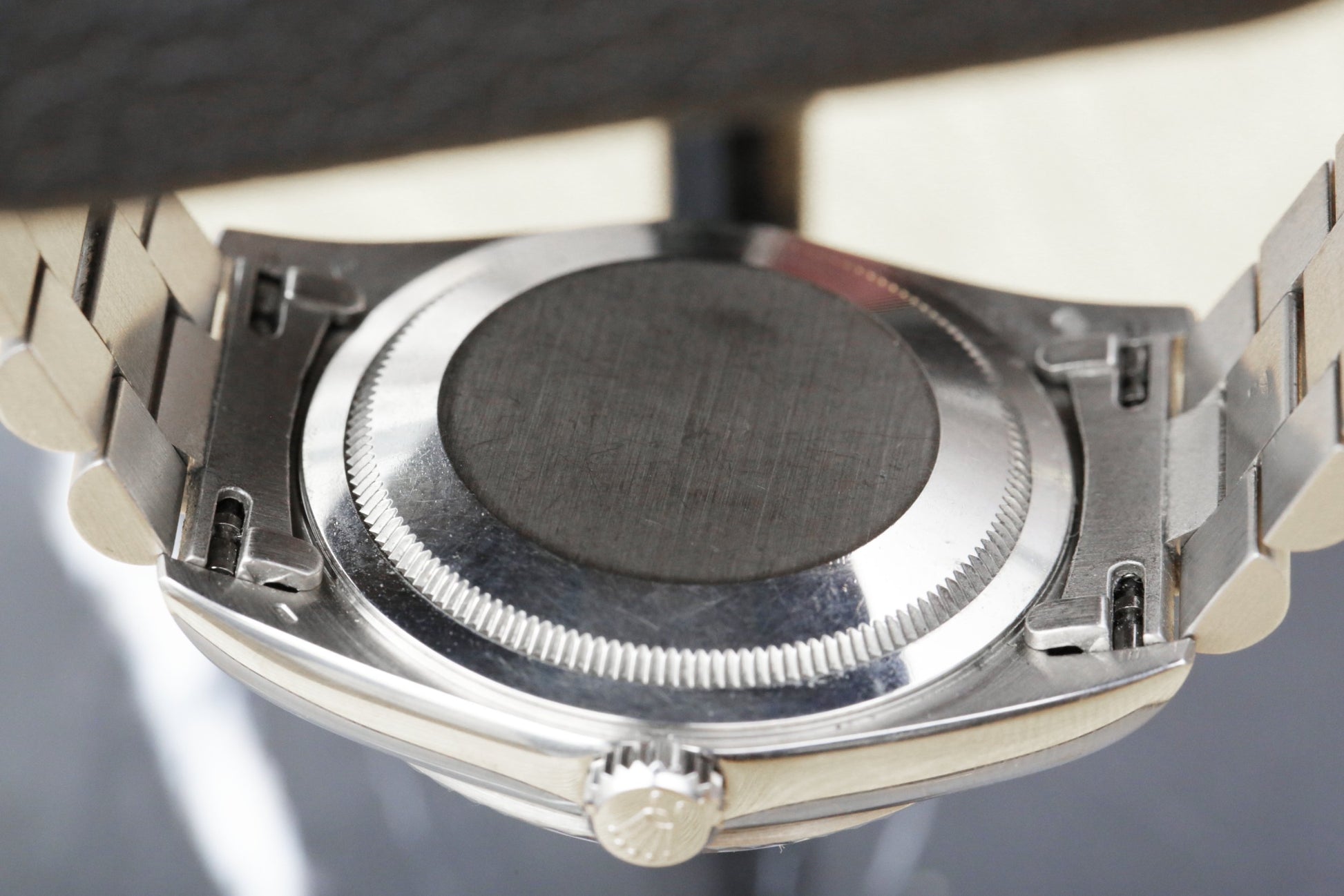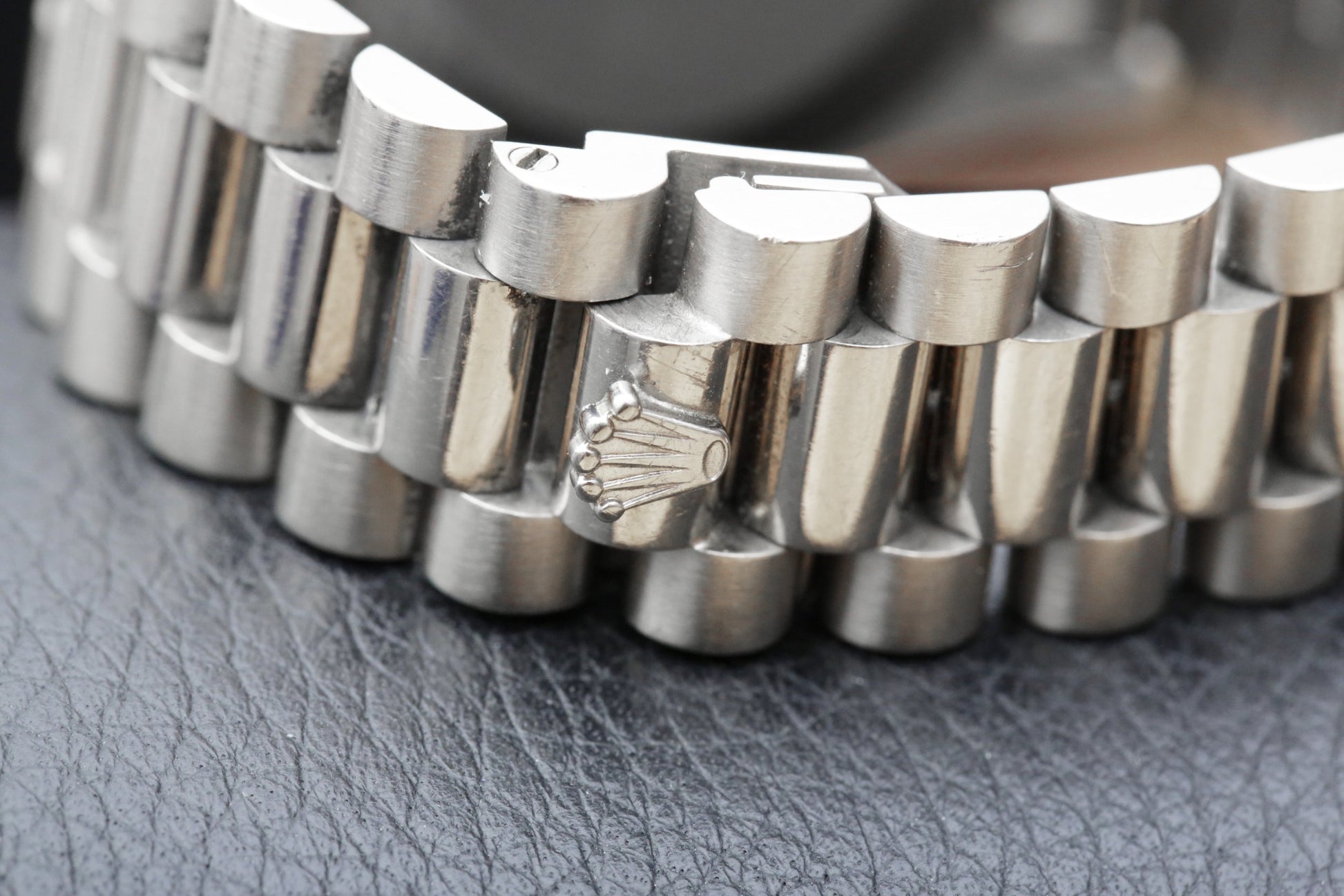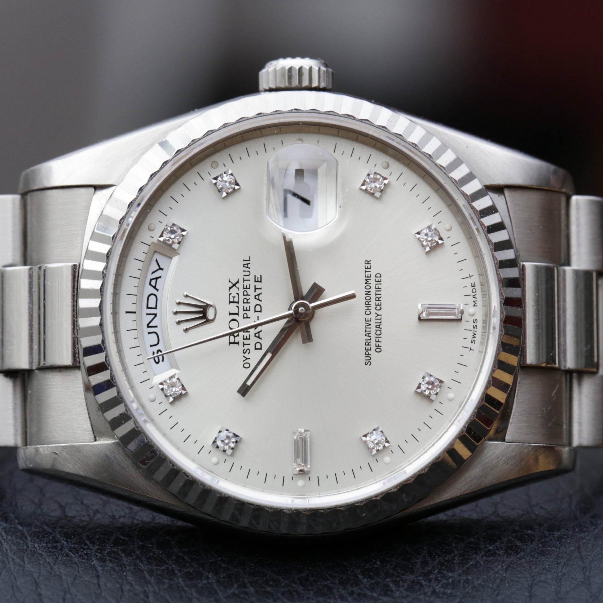 Rolex Day-Date reference 18239 from 1995 with a silver dial set with diamond indexes. The white gold case and bezel remain well preserved, retaining their lines and proportions without the usual signs of wear that often soften this reference. The bracelet clasp still carries a sharp coronet, a small but telling detail that underlines the care given to this piece over the years.