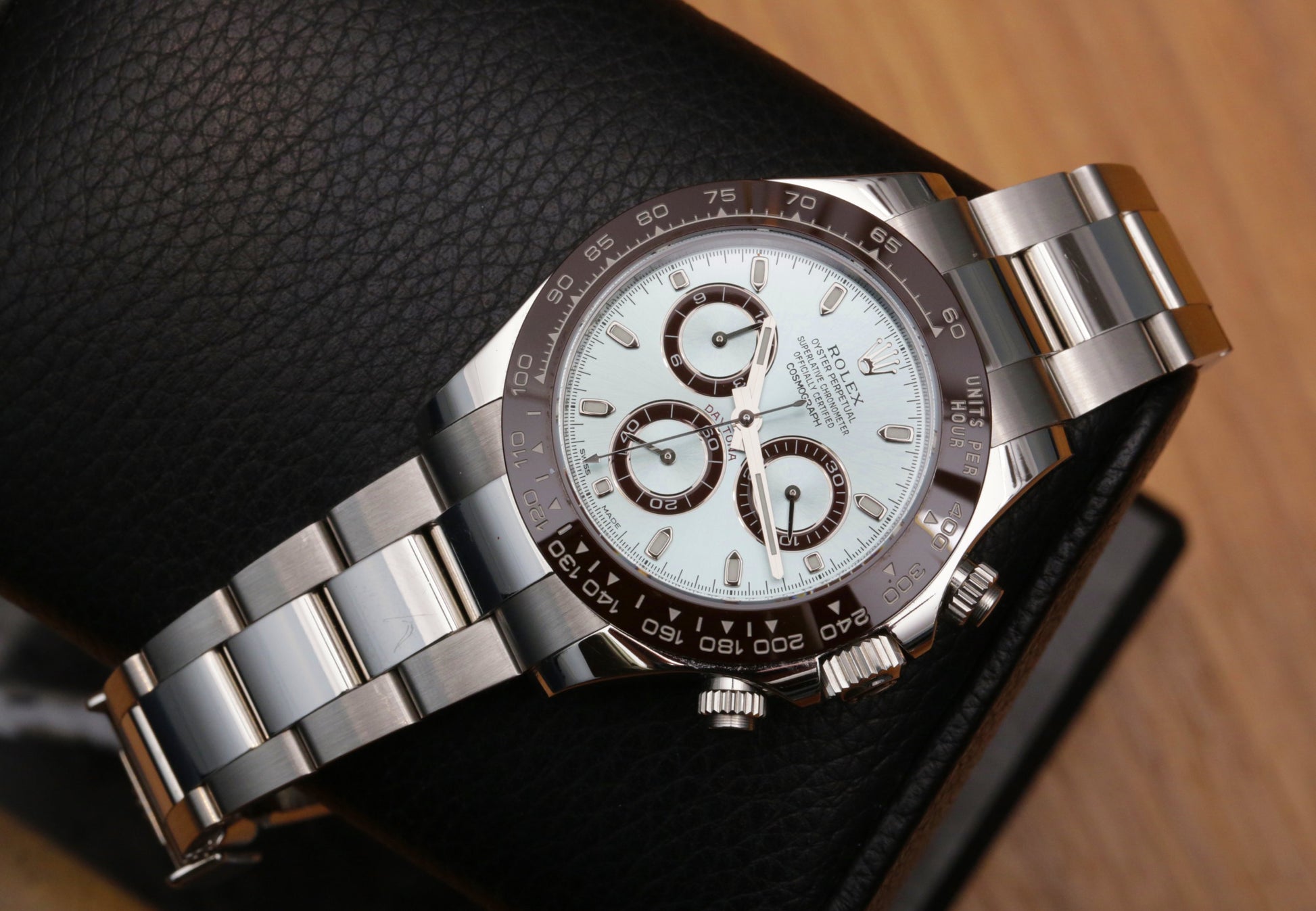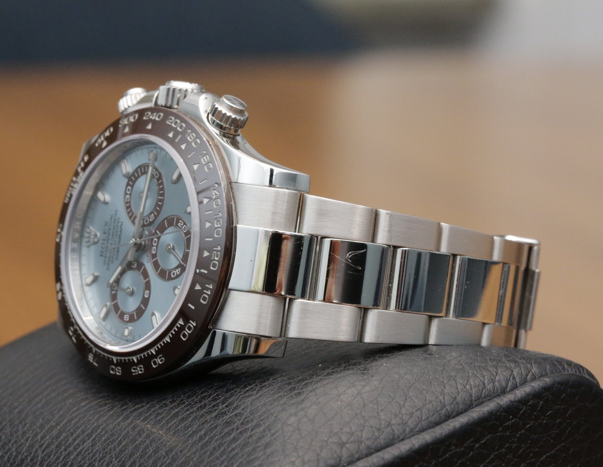 2014 Daytona 116506, the platinum anniversary reference where the ice blue dial only really clicks next to the chocolate brown snailed sub dials and the red Daytona script. Chestnut Cerachrom tachymeter bezel with platinum filled numerals, plus the platinum case with the telltale flat spot lugs and sharp chamfers.