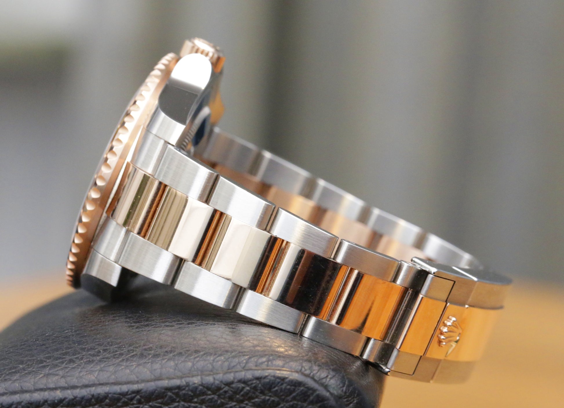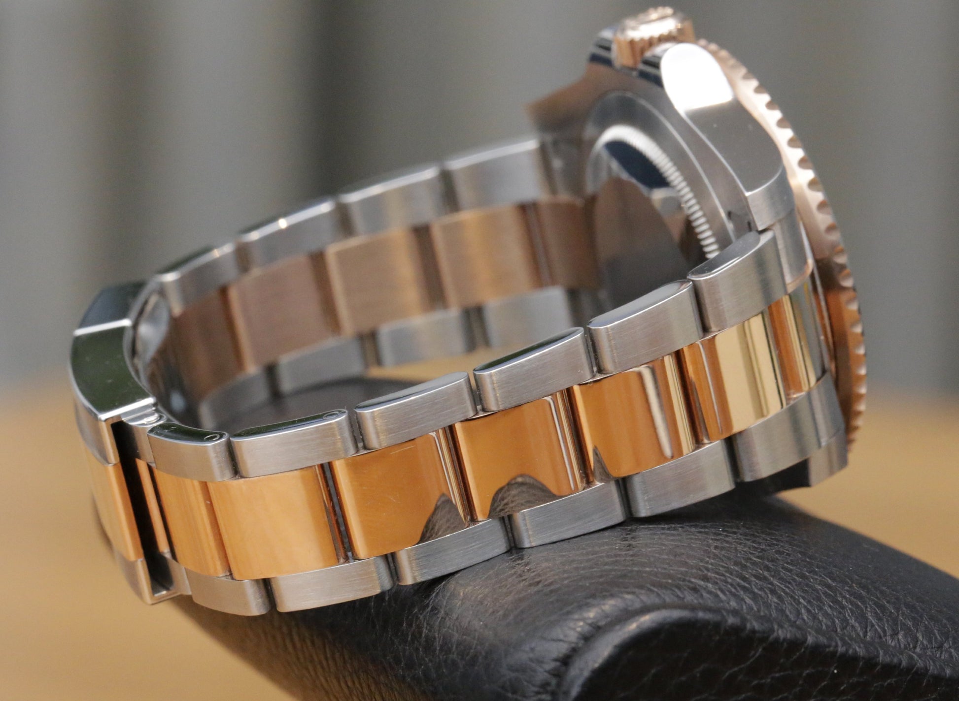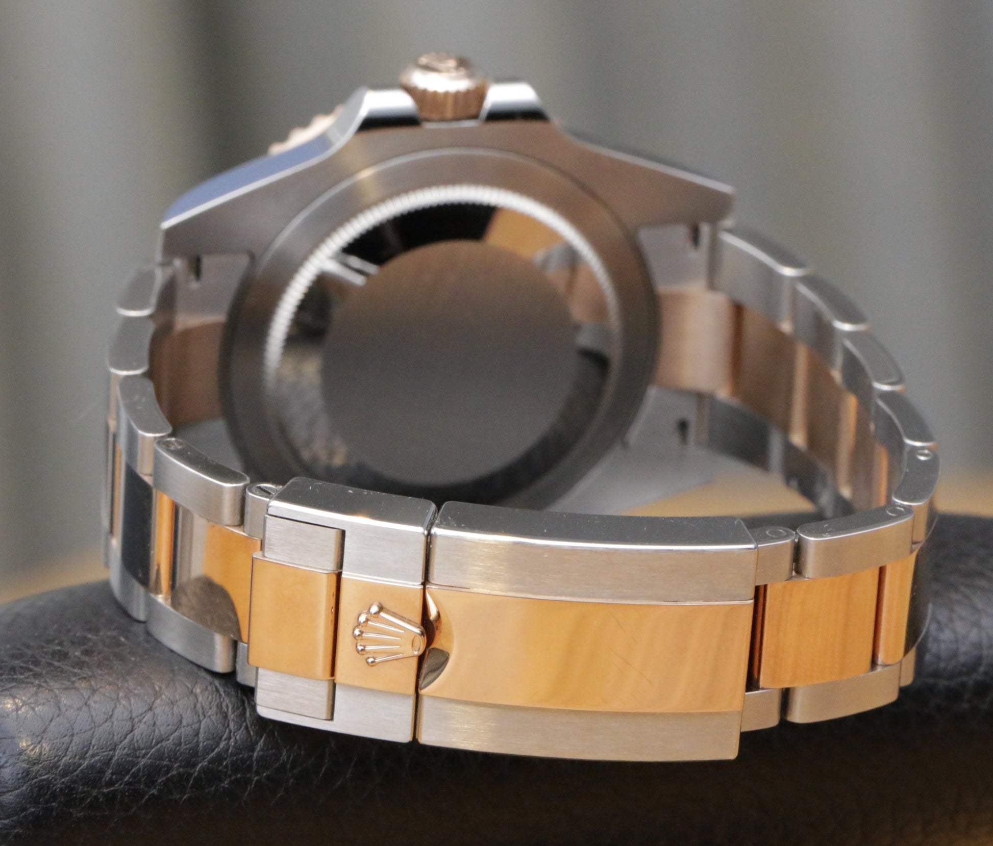 Brown and black Cerachrom insert with Everose numerals, crisp gilt text and Chromalight plots, on the correct Everose Rolesor Oyster bracelet, wears true at about 48 mm lug to lug and 12.1 mm thick for daily use without bulk.