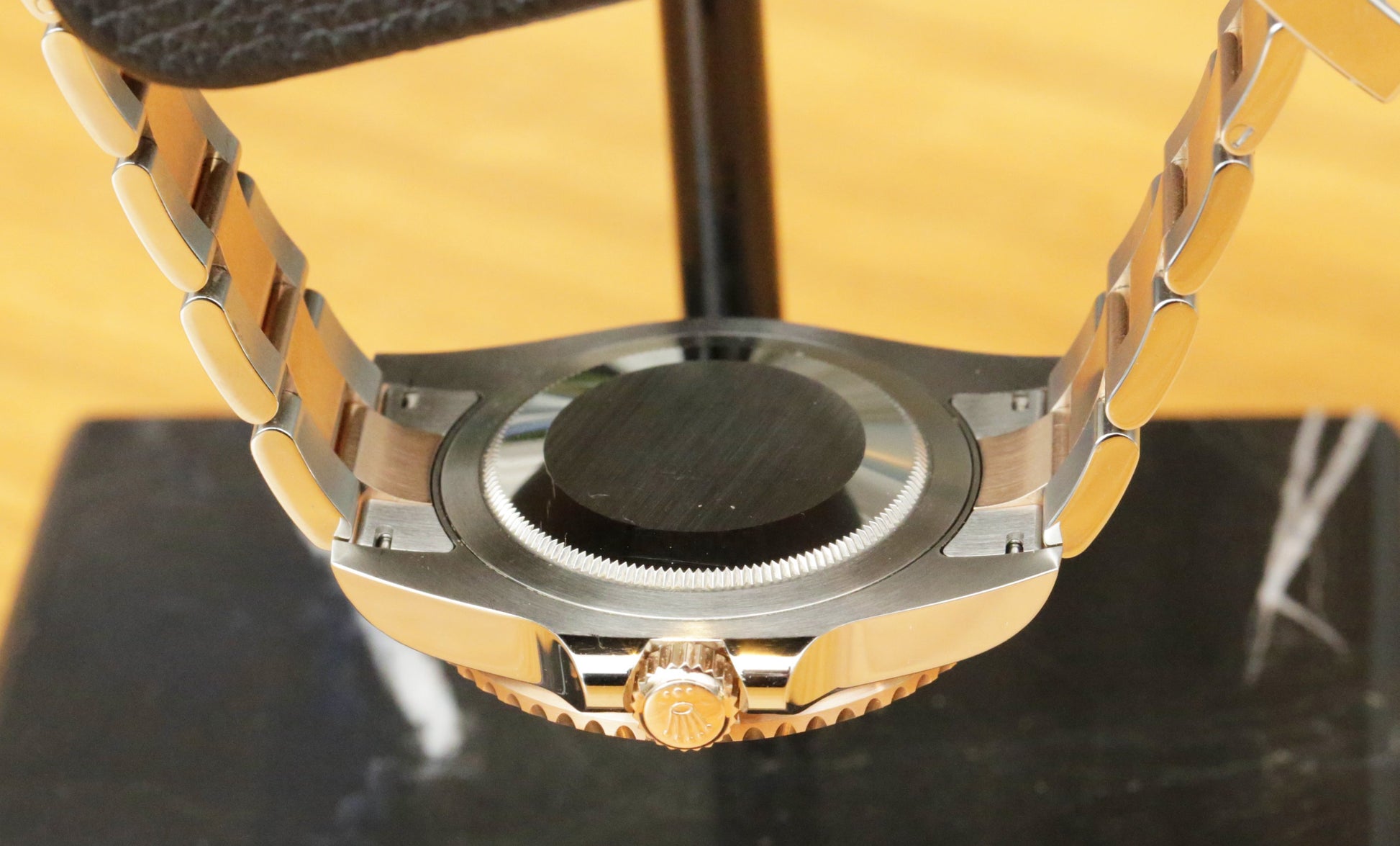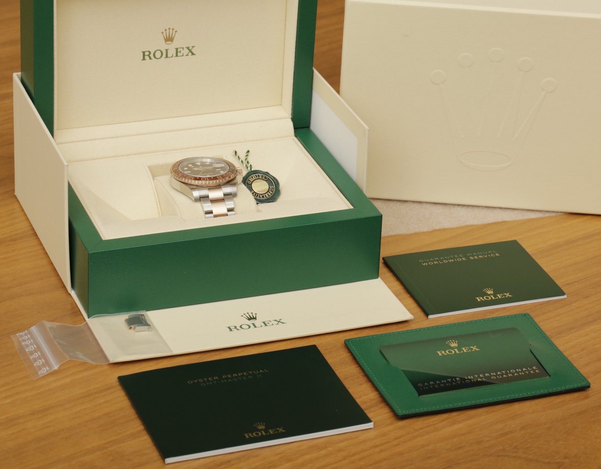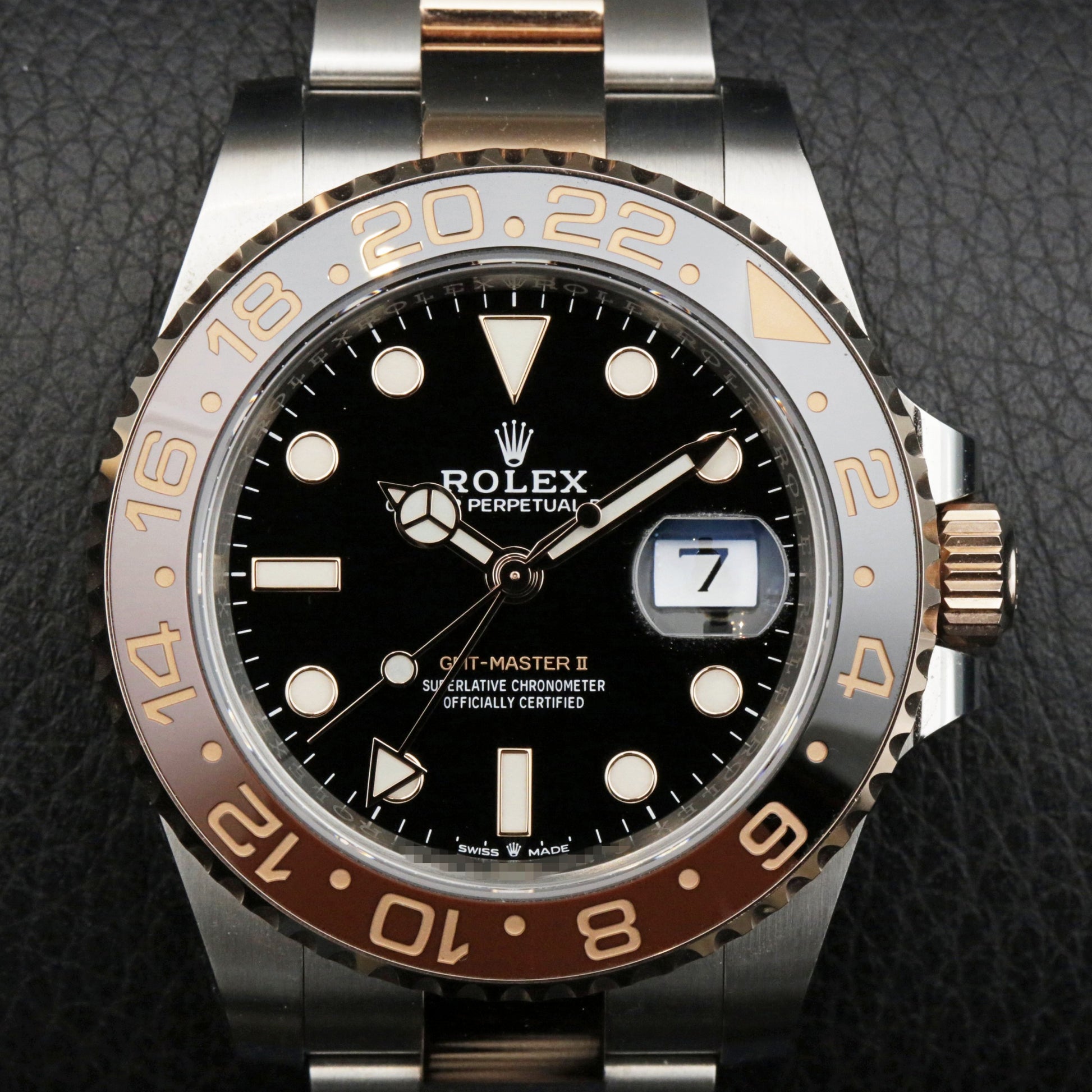 Brown and black Cerachrom insert with Everose numerals, crisp gilt text and Chromalight plots, on the correct Everose Rolesor Oyster bracelet, wears true at about 48 mm lug to lug and 12.1 mm thick for daily use without bulk.