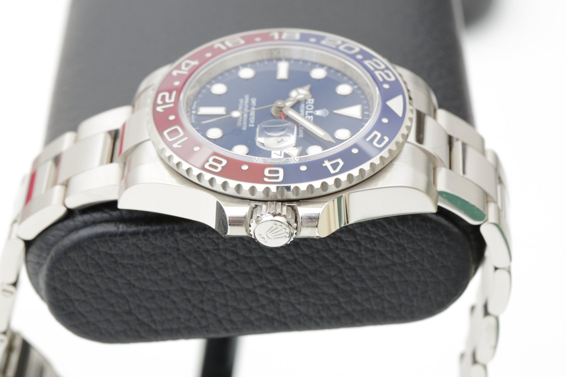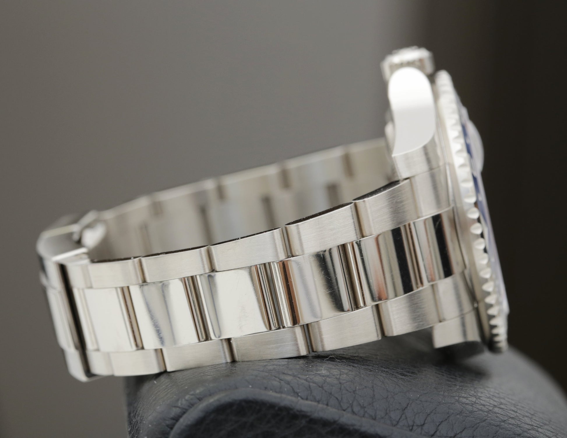 Rolex GMT Master II 126719BLRO blue dial from 2023 with original stickers on clasp and crown guards plus first purchase invoice from a Swedish Rolex AD. The blue lacquer dial is a low volume configuration produced over a short production window within the 126719BLRO run, pairing with the later Pepsi ceramic that shows cleaner colour separation. Chromalight plots have rounded profiles with sharp white metal surrounds. Real world wear is balanced at approximately 48 mm lug to lug and about 12.1 mm thick on the white gold Oyster with Easylink.