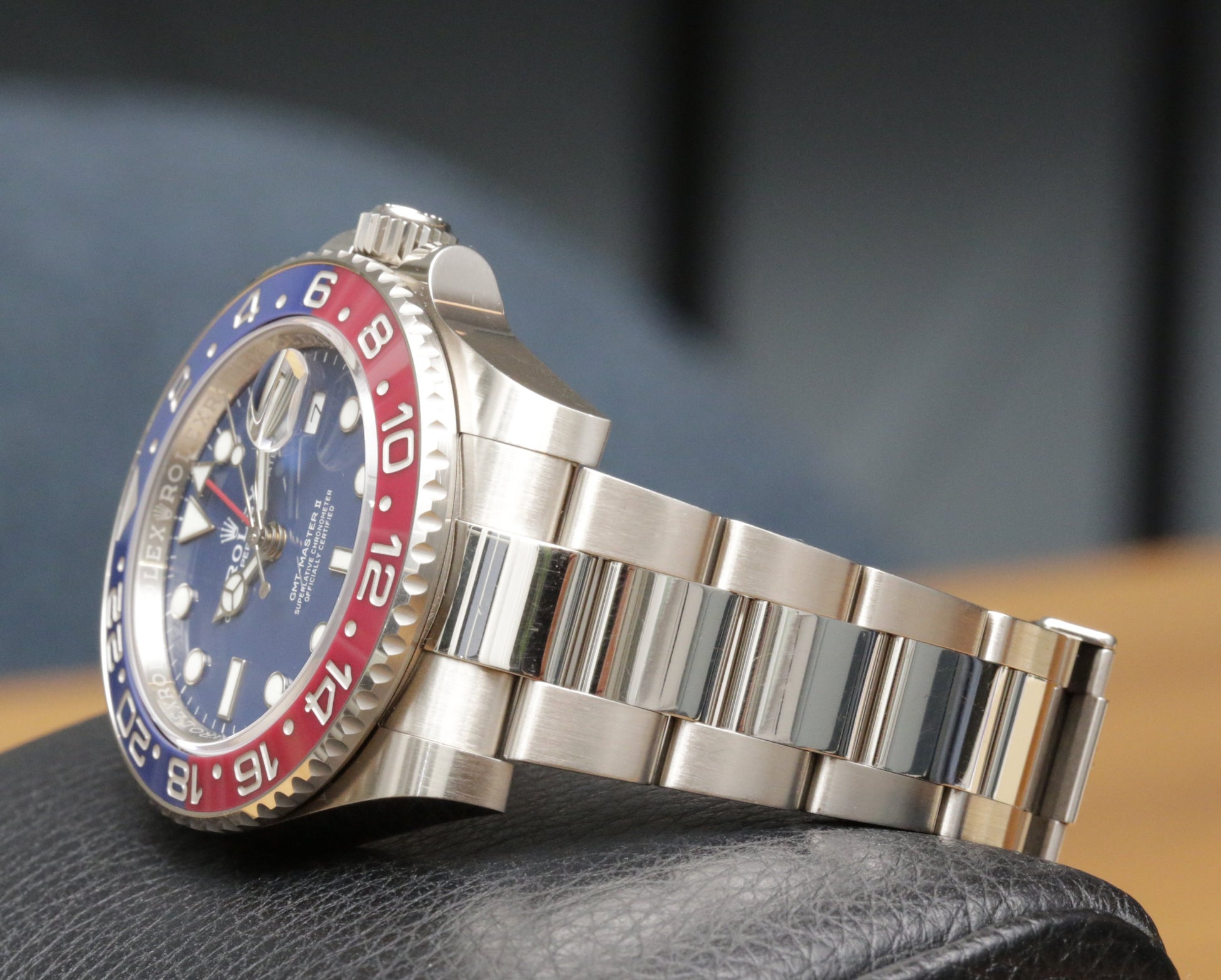 2022 126719BLRO in 18 ct white gold with the later blue dial, a collector’s pick over the meteorite. Born in 1955 for Pan Am pilots, the Pepsi bezel became the GMT signature. 40 mm Oyster case, red and blue Cerachrom 24 hour bezel, white gold Oyster bracelet with Oysterlock and Easylink 5 mm extension, Chromalight filled markers and date at 3. Swedish authorised dealer invoice included.