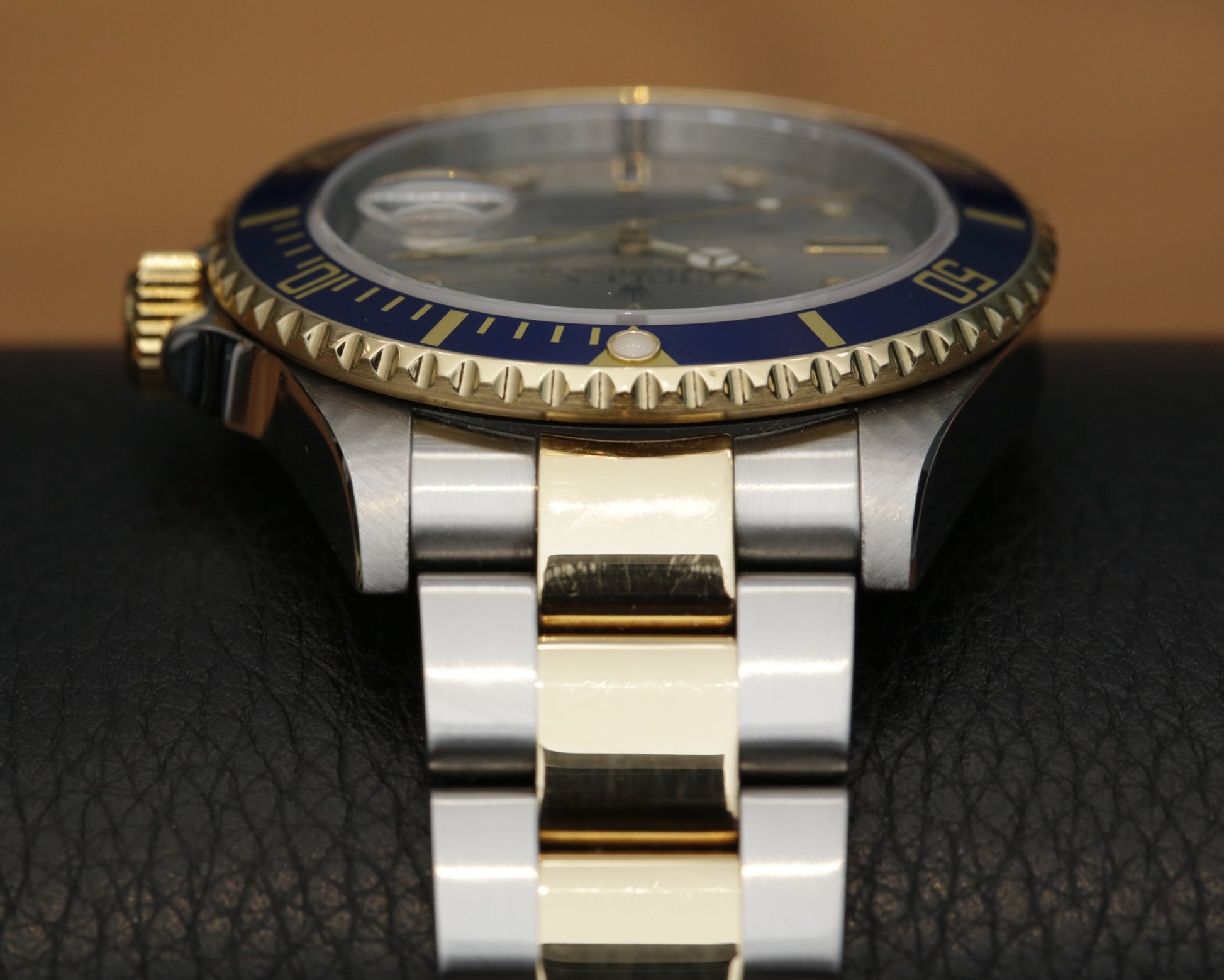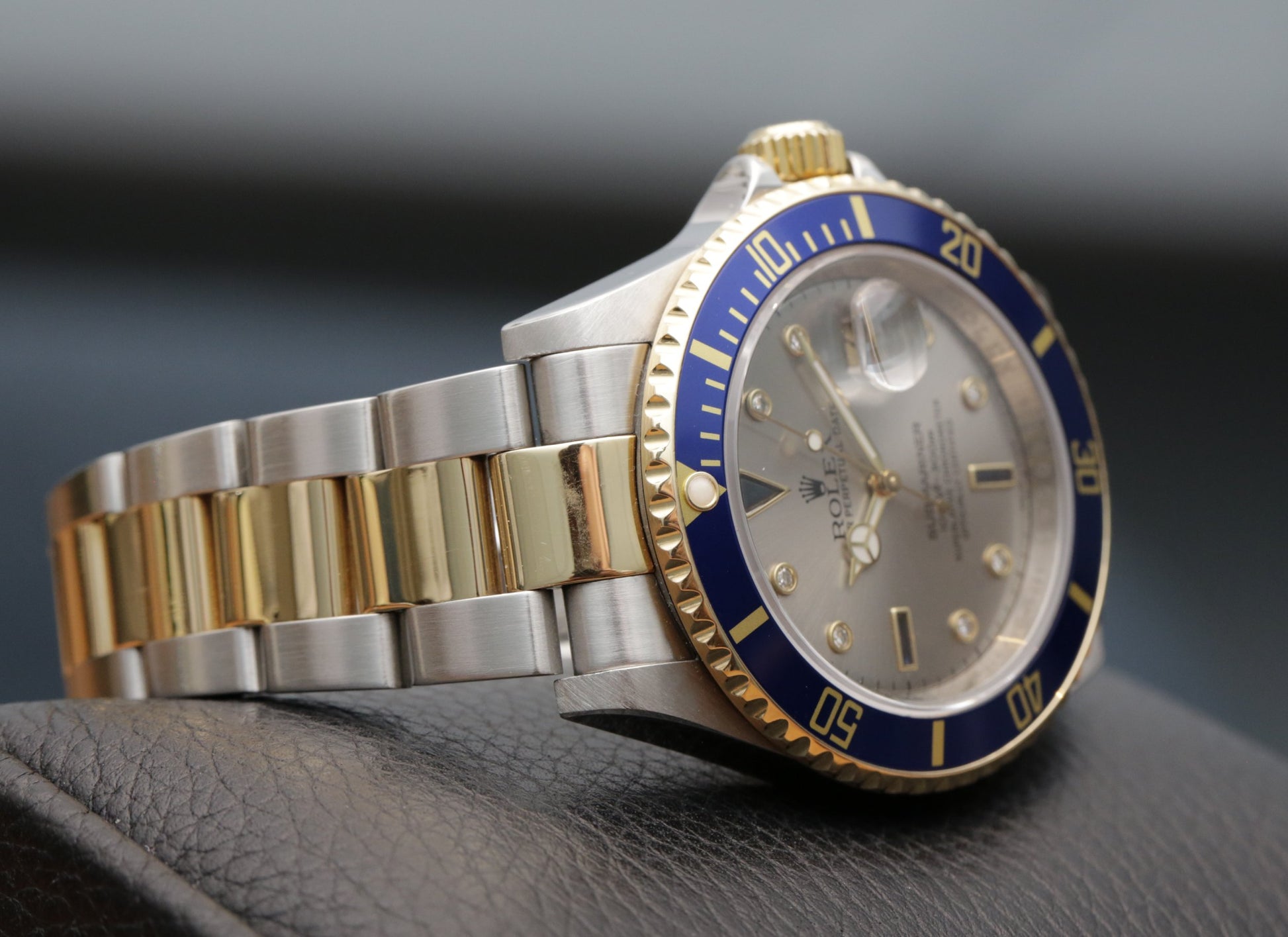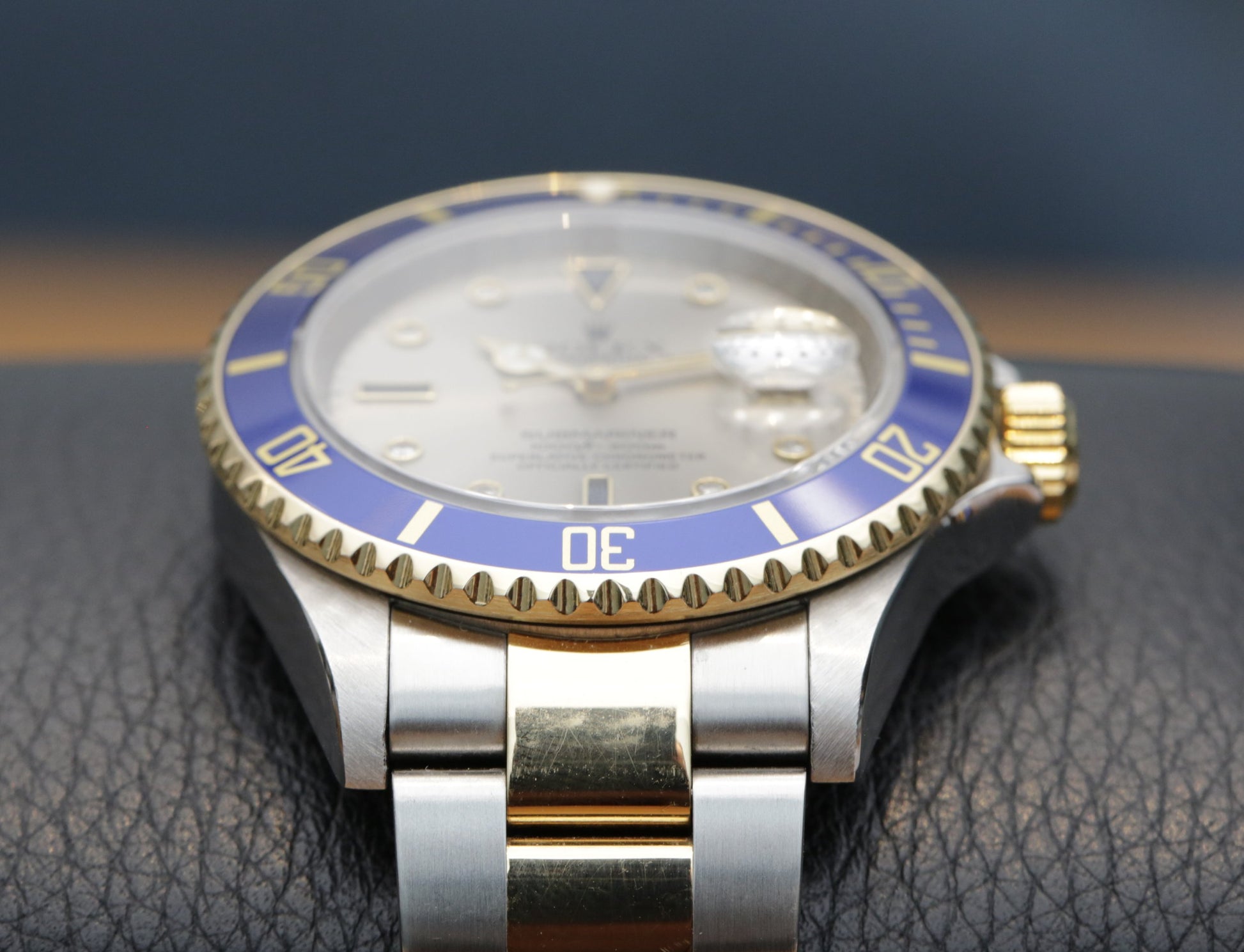 Here’s a 2008 Submariner 16613 with the silver Serti dial, in very sharp condition and with a bracelet that shows practically no stretch. The interplay between the silver toned dial and the factory-set sapphires and diamonds gives this reference its unmistakable character, a configuration that stood apart in the two-tone line. At 40 mm, the proportions remain classic, yet the depth of the tritium-era styling edges into something more opulent here, especially under shifting light where the dial can appear almost metallic.